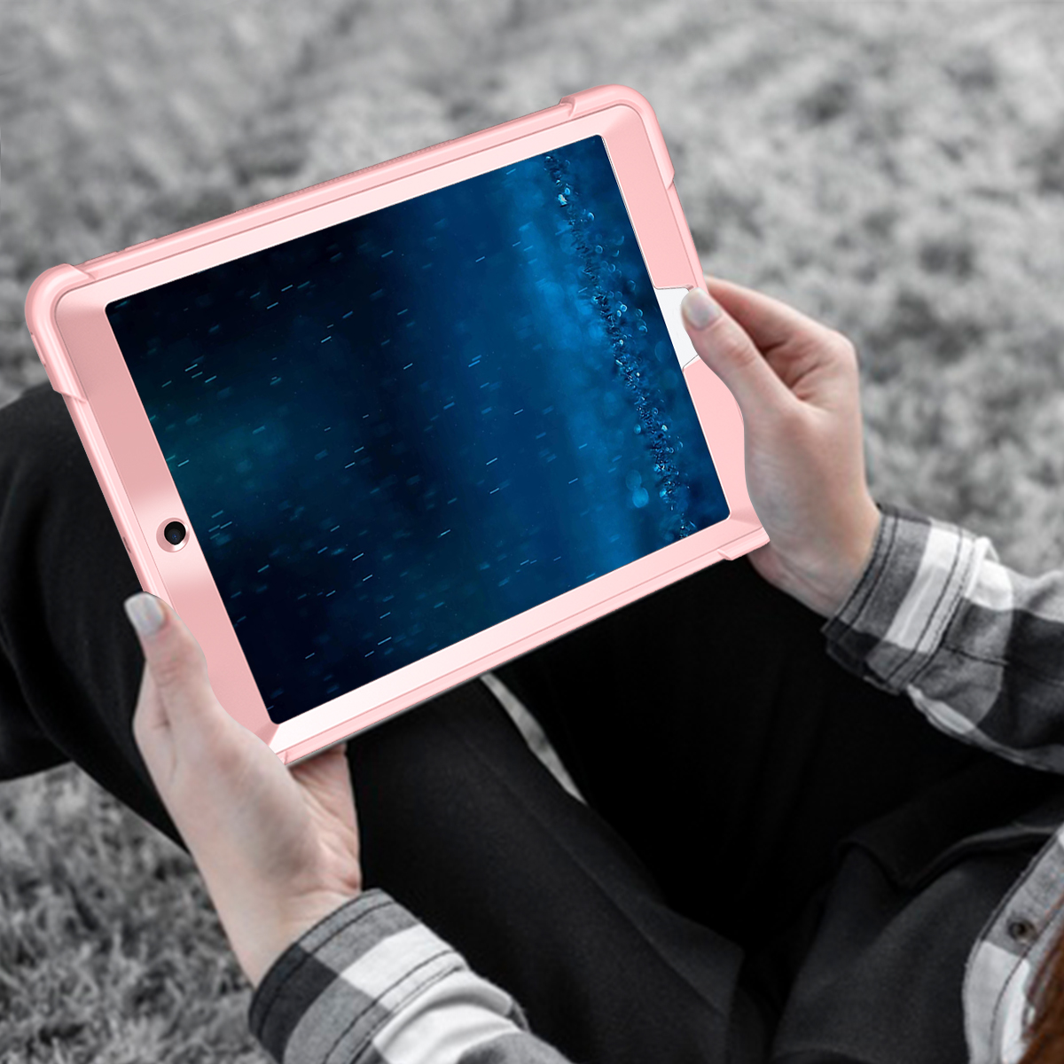 A robust tablet case with anti-slip design and 3-in-1 shockproof protection for iPad 9.7 (2017/2018). Includes a built-in stand for convenient hands-free use.