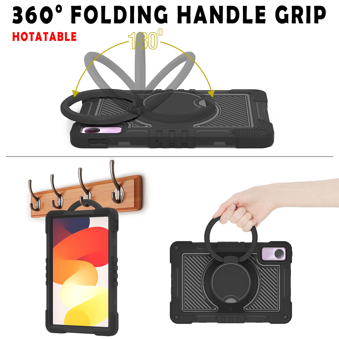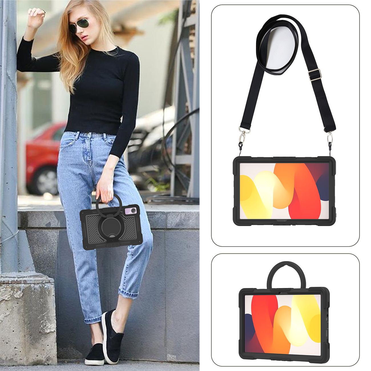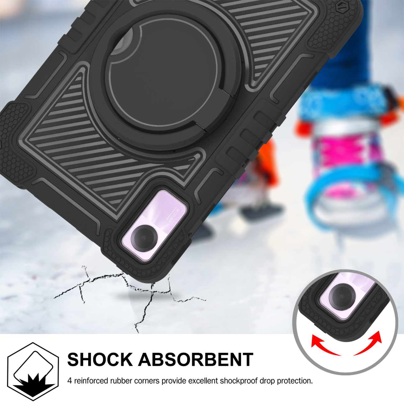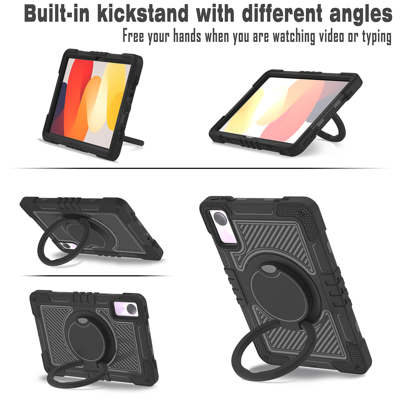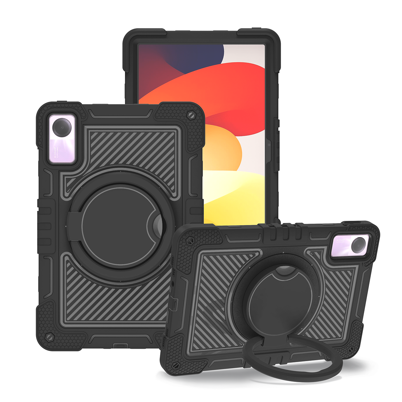 Professional all-black rugged case with full protection, rotating ring, and kickstand for Redmi Pad SE 4G.
