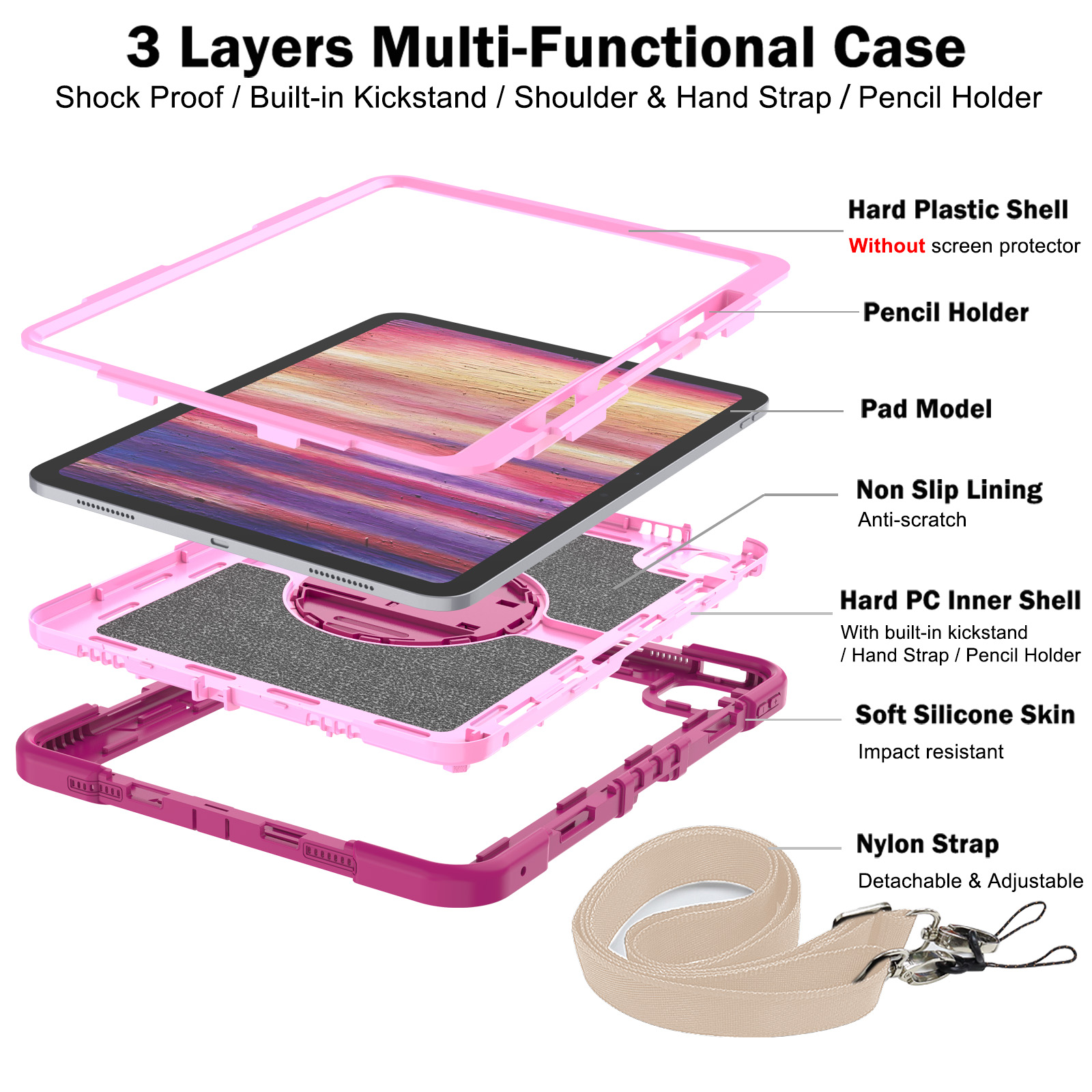 TOZIZO Heavy Duty Rugged iPad Air 13 Case - Rose Red + Pink with Kickstand & Strap
