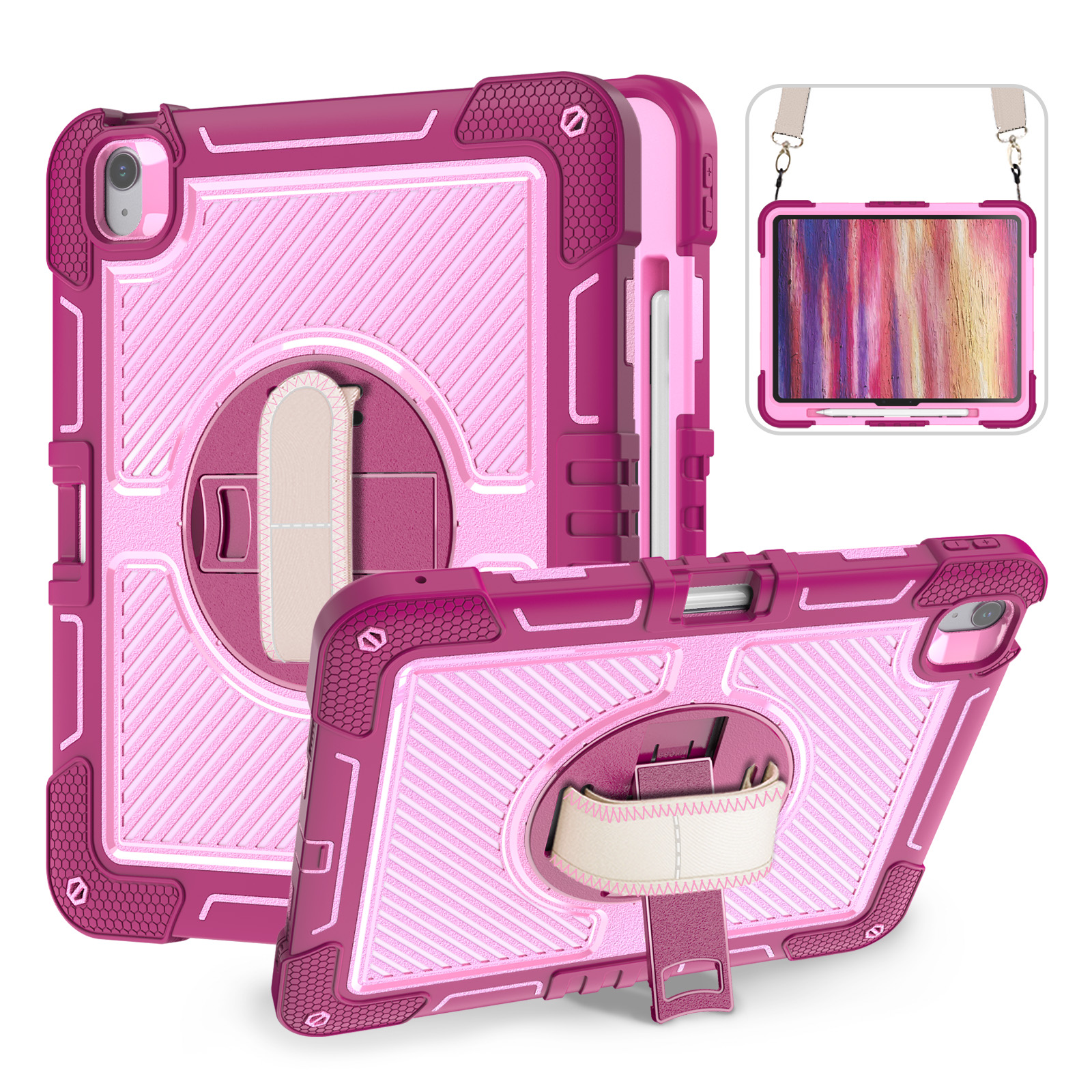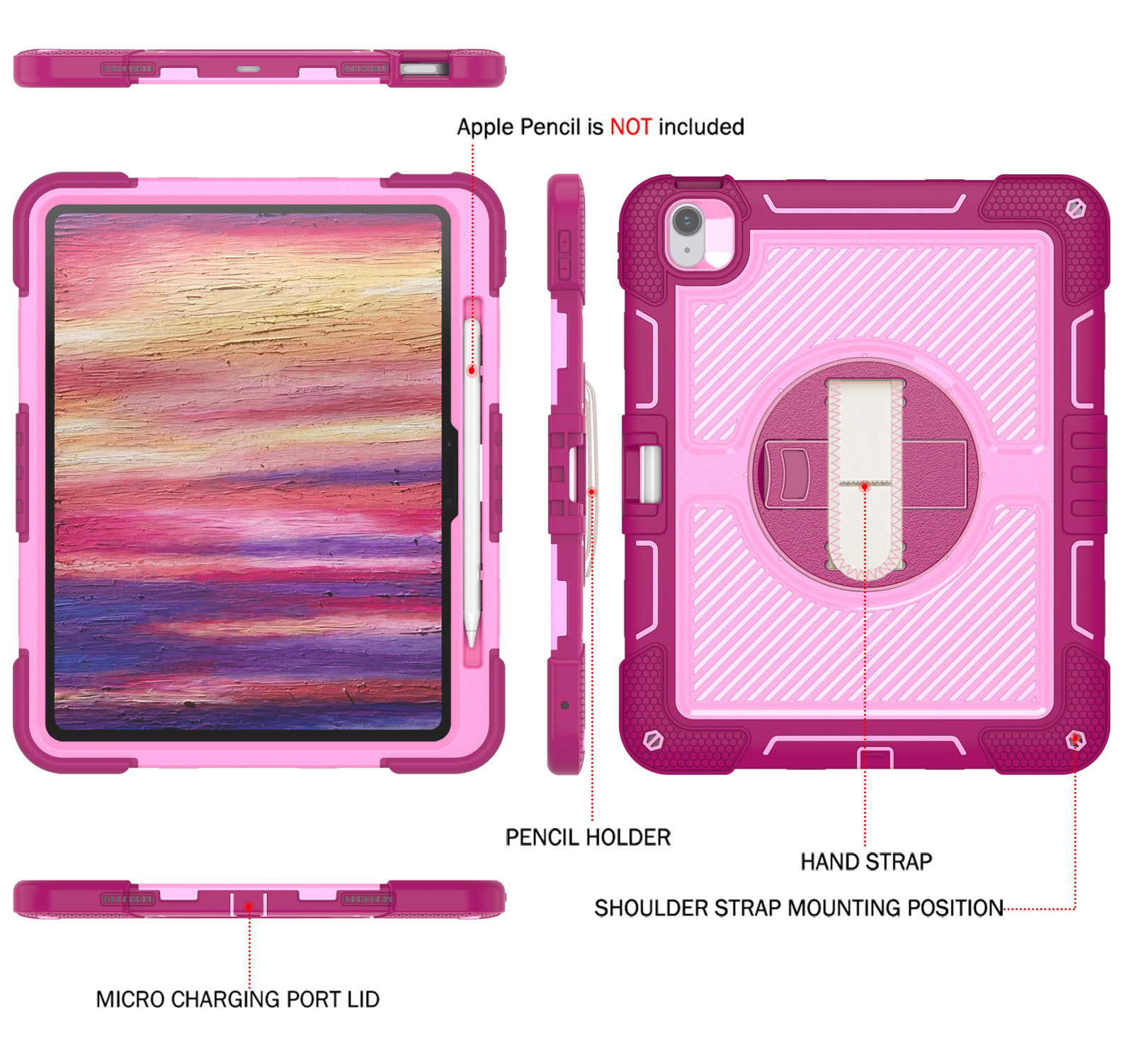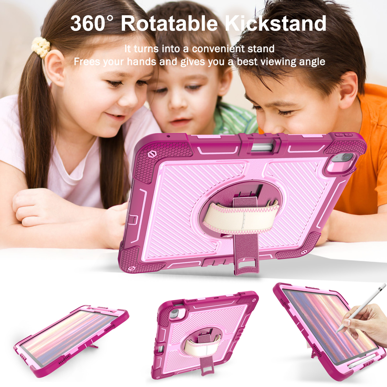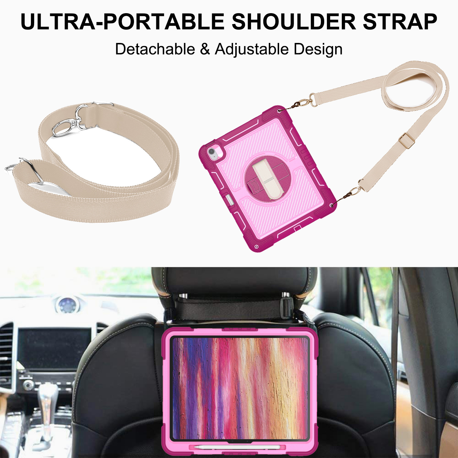 Full-body shockproof case for iPad Air 13 (2024) in rose red & pink, features triple-layer protection, rotatable stand, and detachable strap.