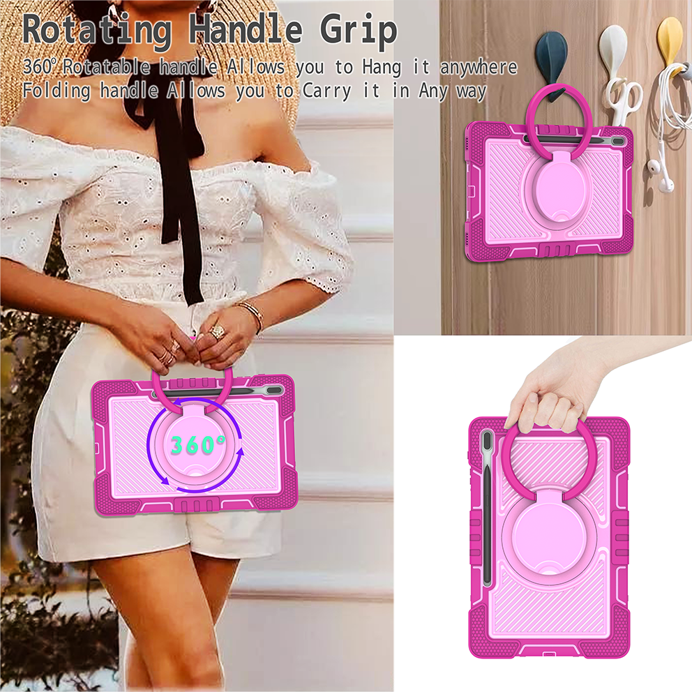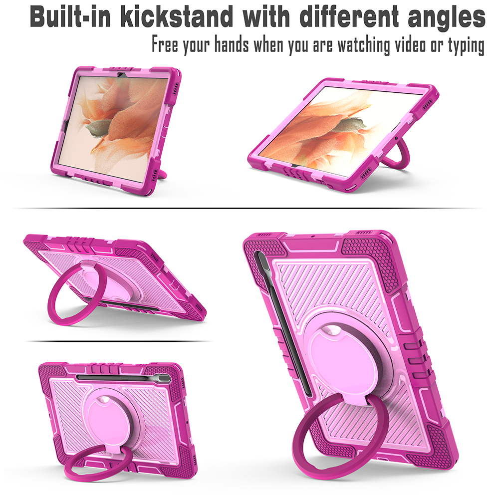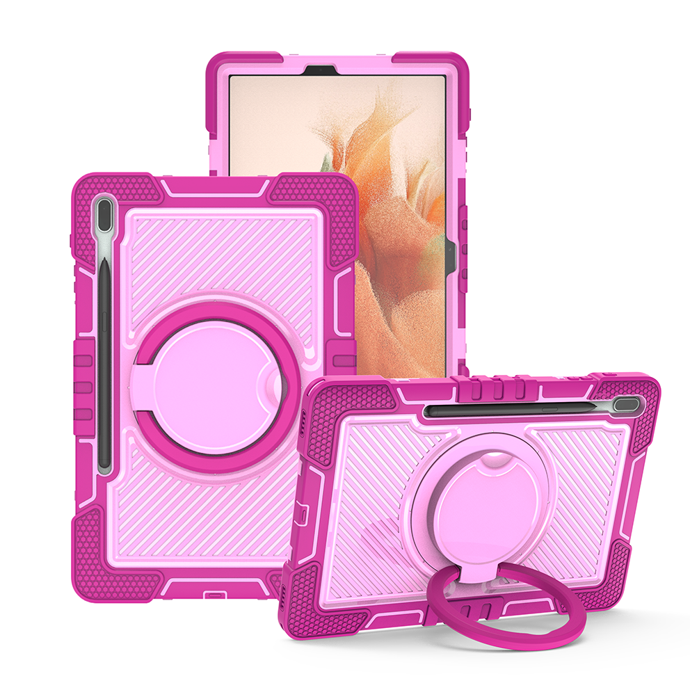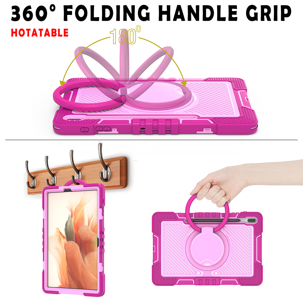 Bright and durable case for Samsung Tab S7 Plus 12.4 inch in rose red and pink, features 360° rotation kickstand, triple-layer shockproof protection, and magic ring grip.