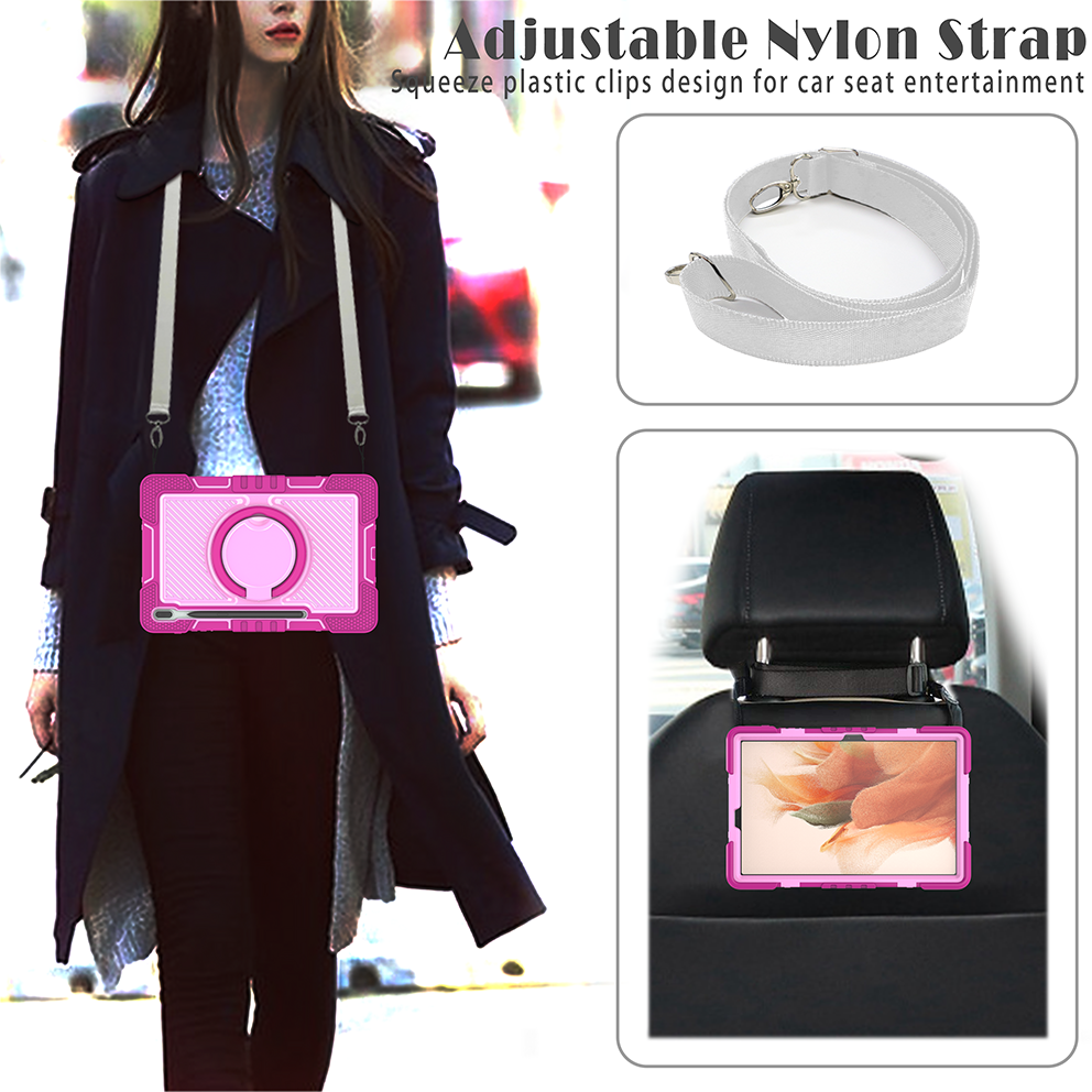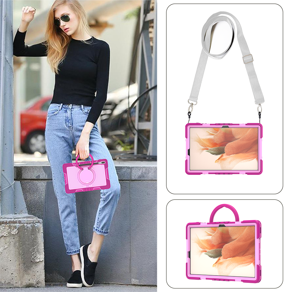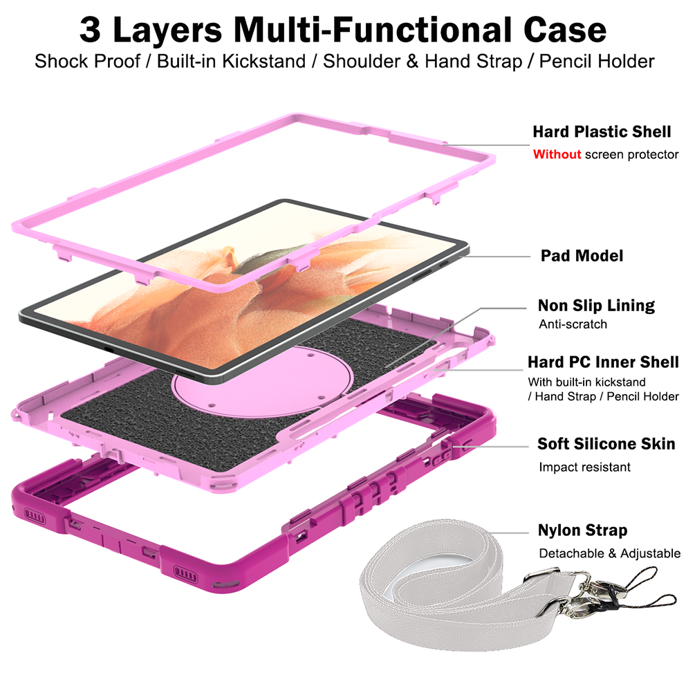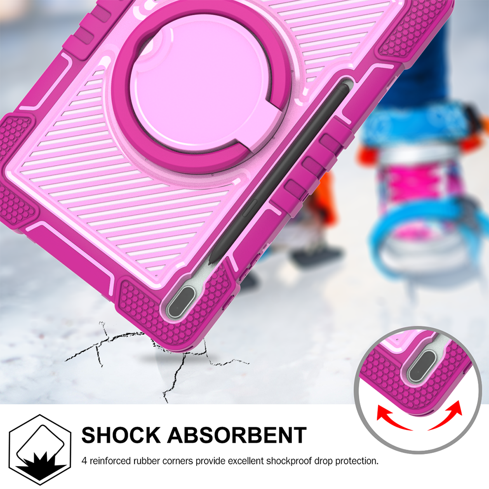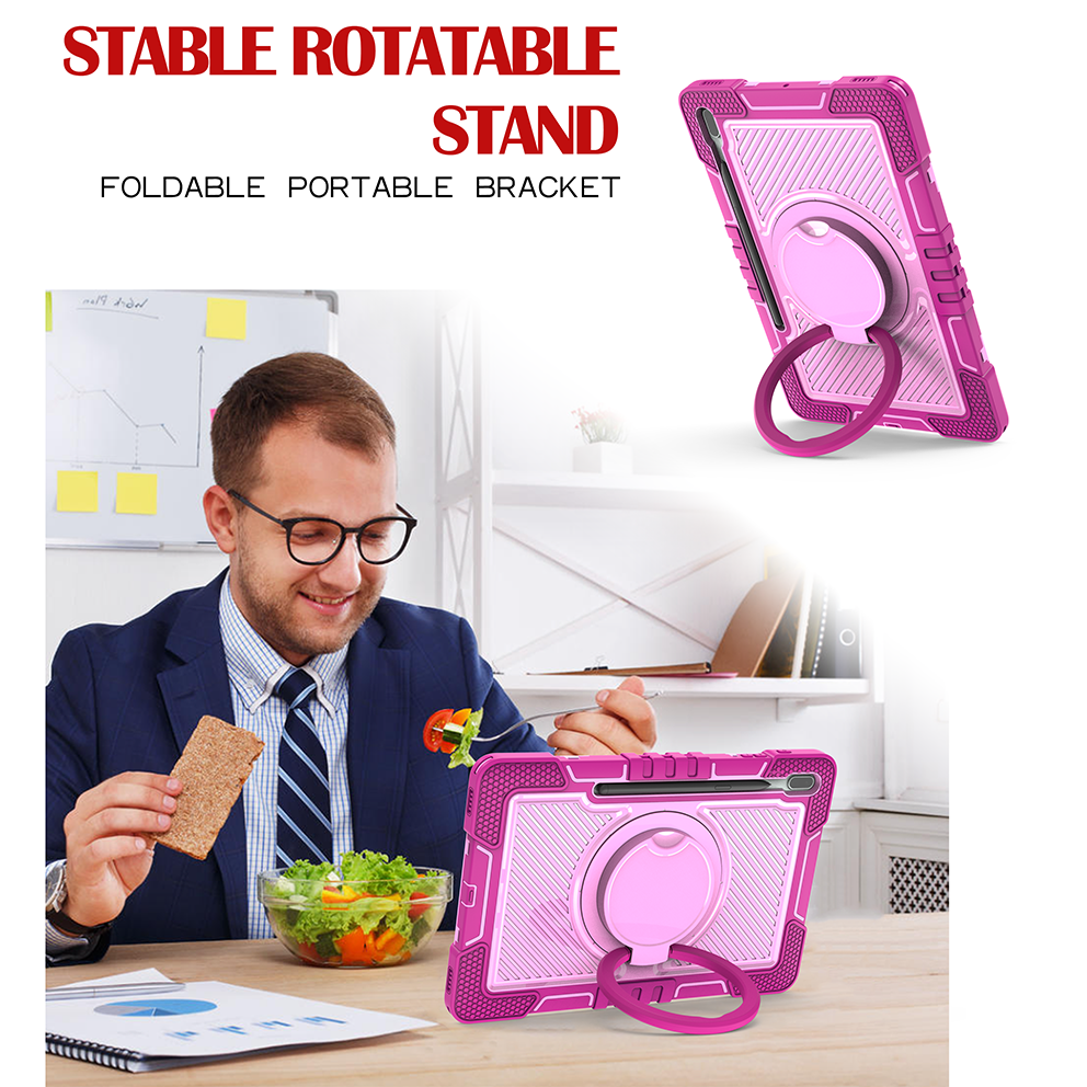 Bright and durable case for Samsung Tab S7 Plus 12.4 inch in rose red and pink, features 360° rotation kickstand, triple-layer shockproof protection, and magic ring grip.