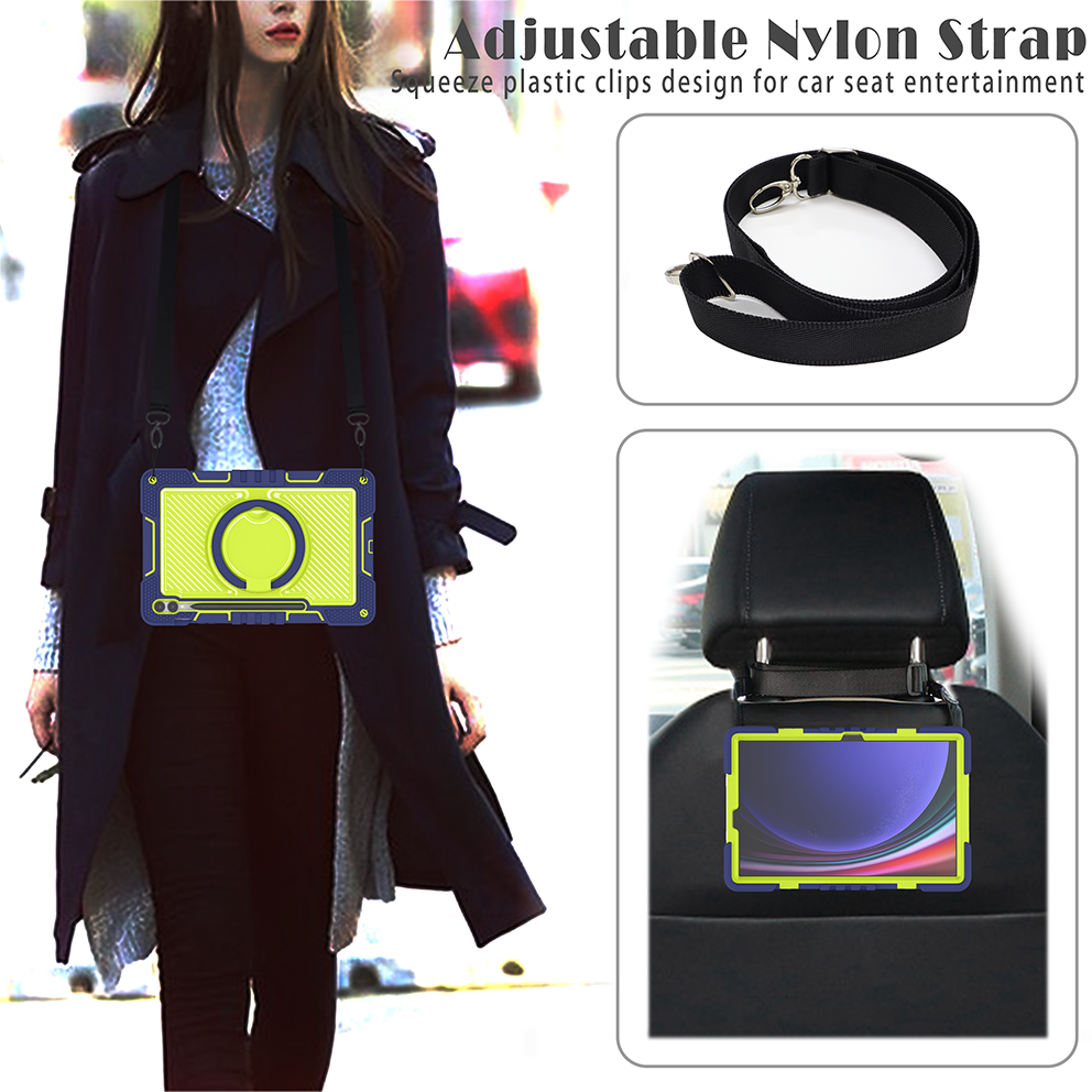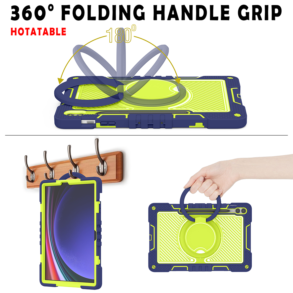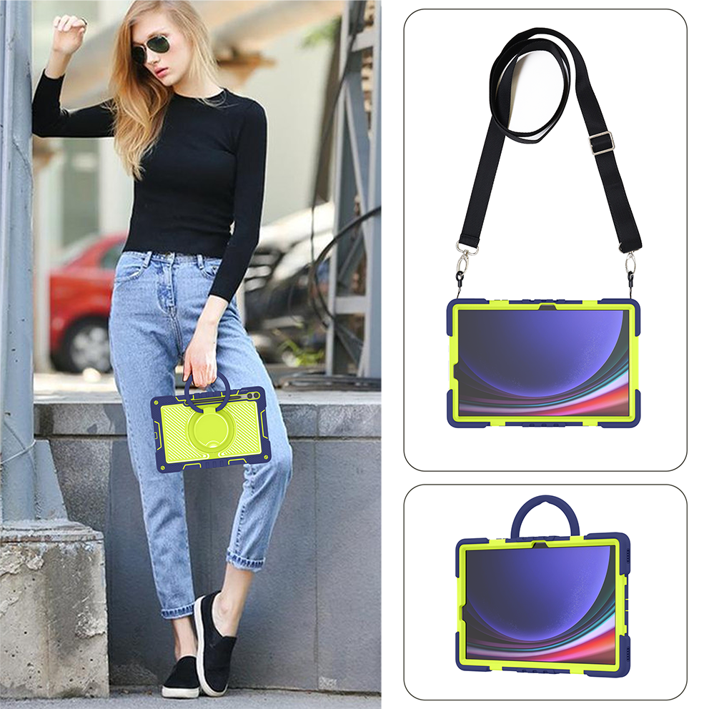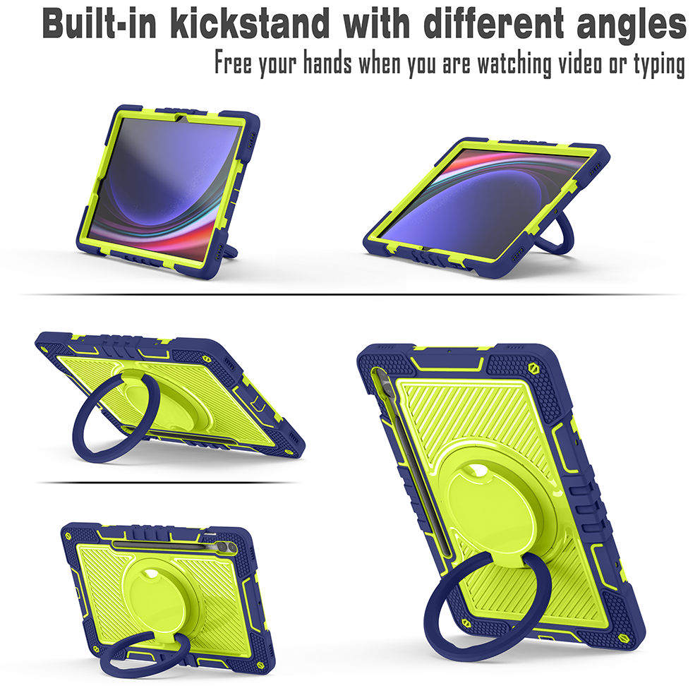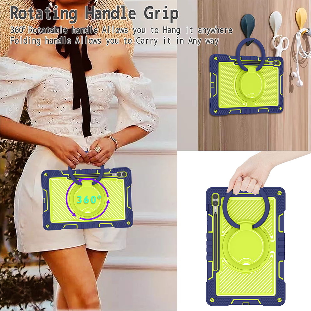 TOZIZO Navy Blue & Yellow-Green Rugged Case for Samsung Tab S9 Plus - 360° Rotatable Kickstand & Hand Strap