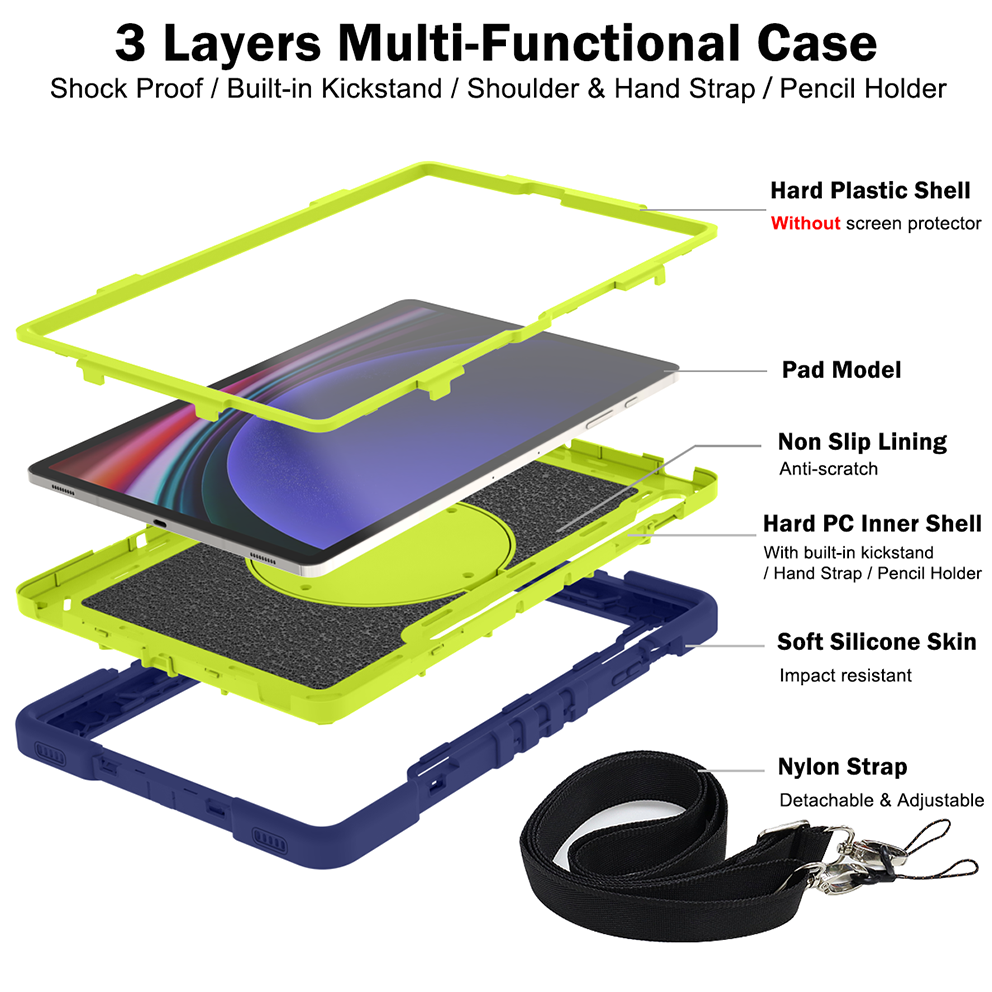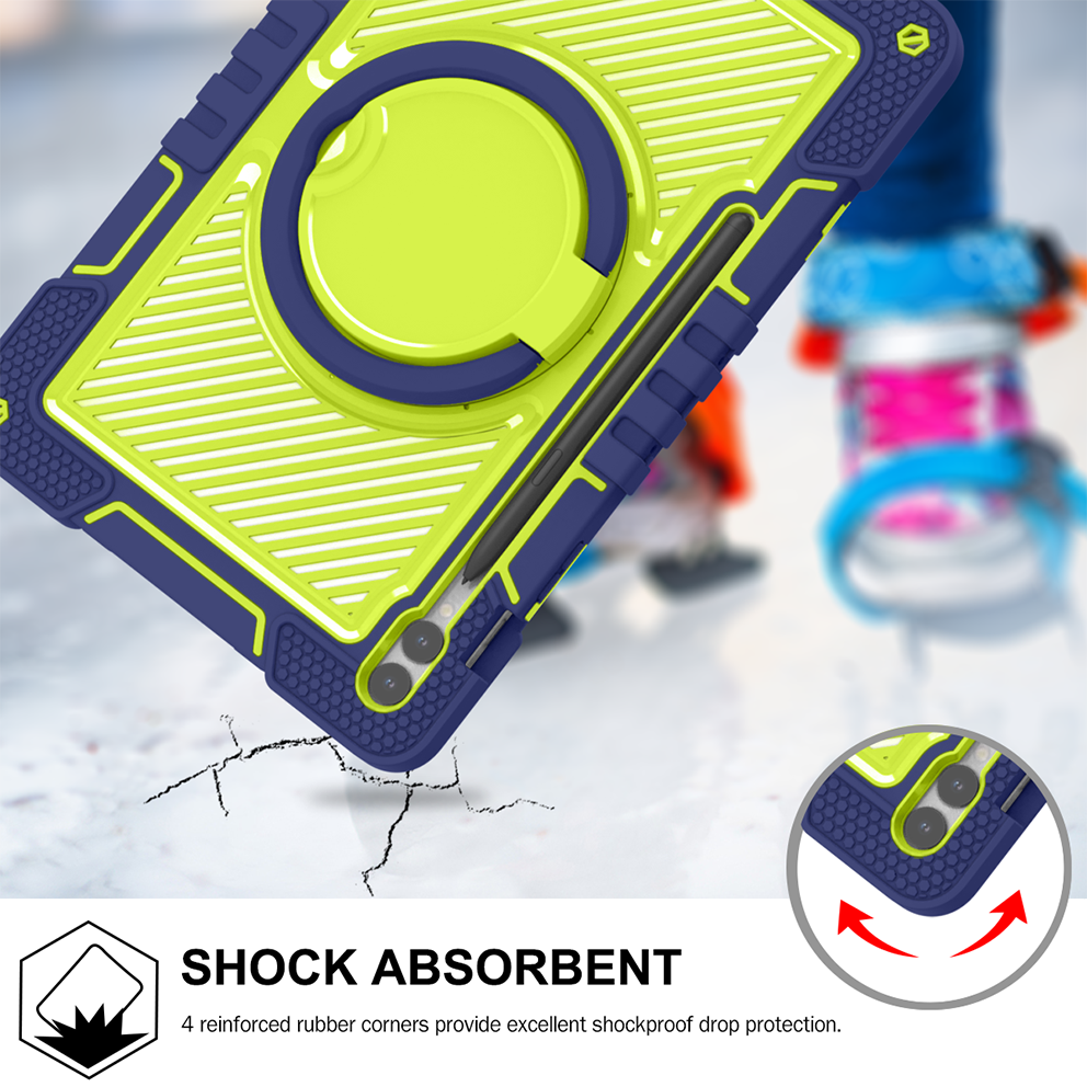 Heavy Duty Triple Layer Protective Tablet Case with Rotating Stand, Shockproof Silicone Grip Cover for Samsung Galaxy Tab S9 Plus 12.4 inch - Navy Blue & Yellow-Green