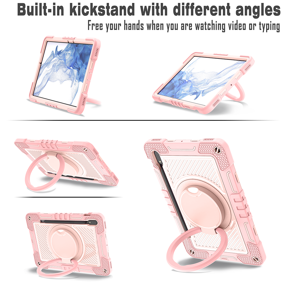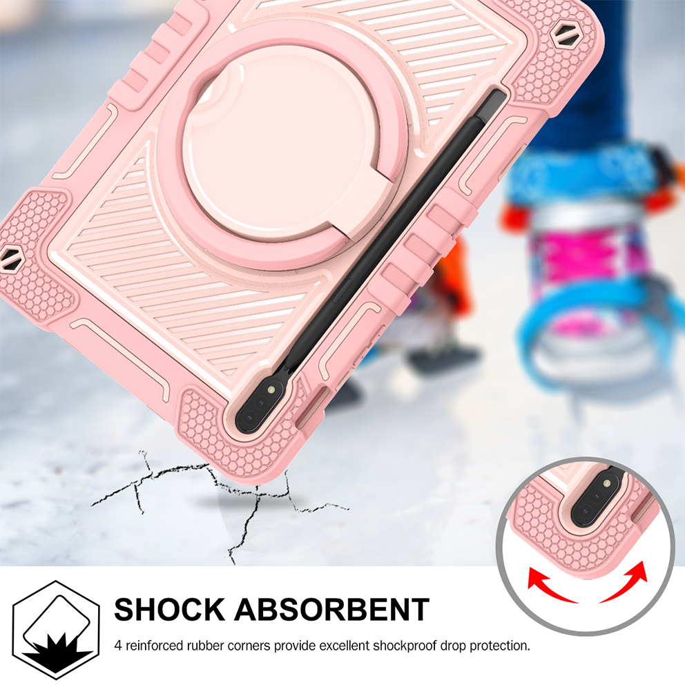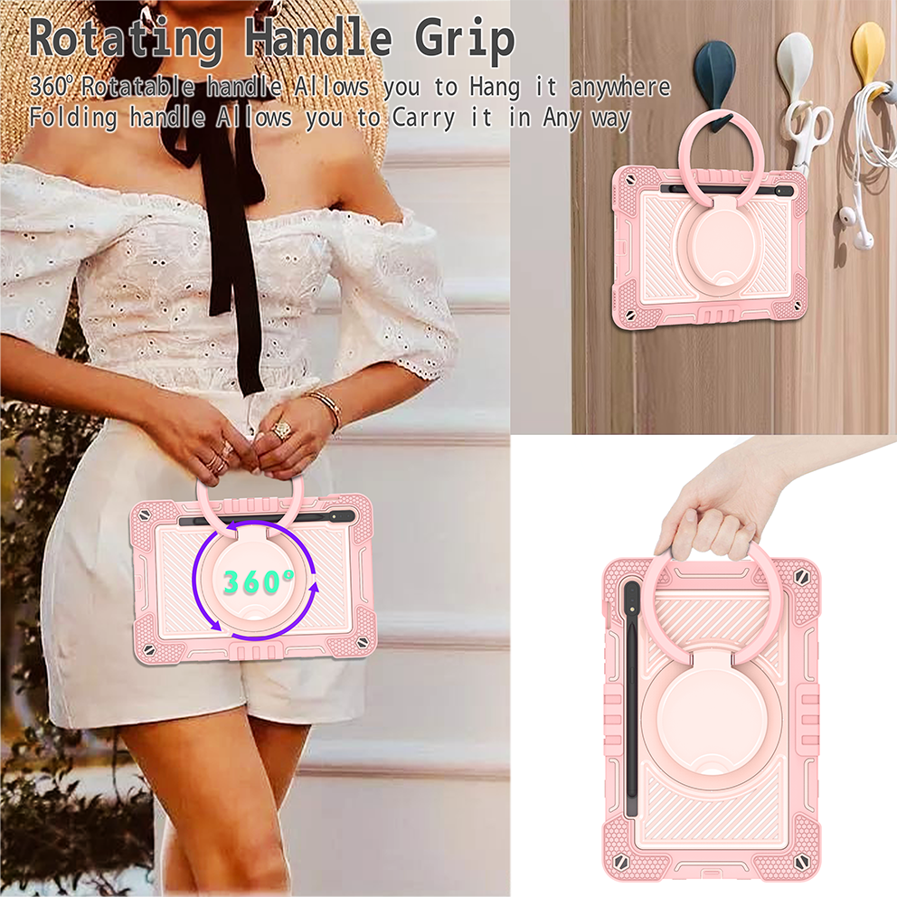 Chic pink rugged case for Samsung Galaxy Tab S7 11'', with 360° rotation grip stand, triple-layer silicone design, and child-safe protection.