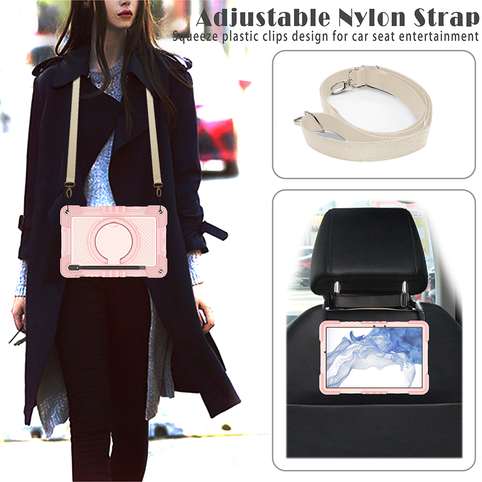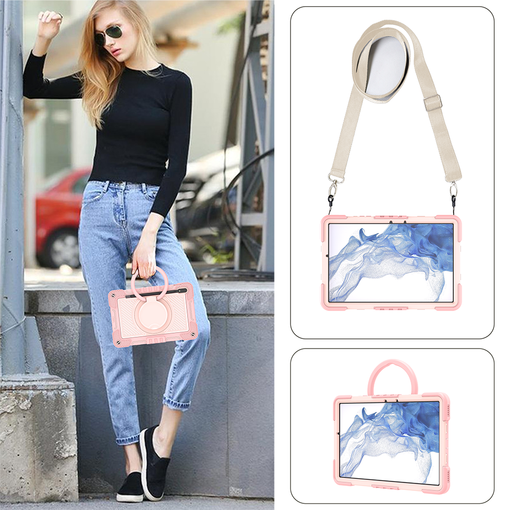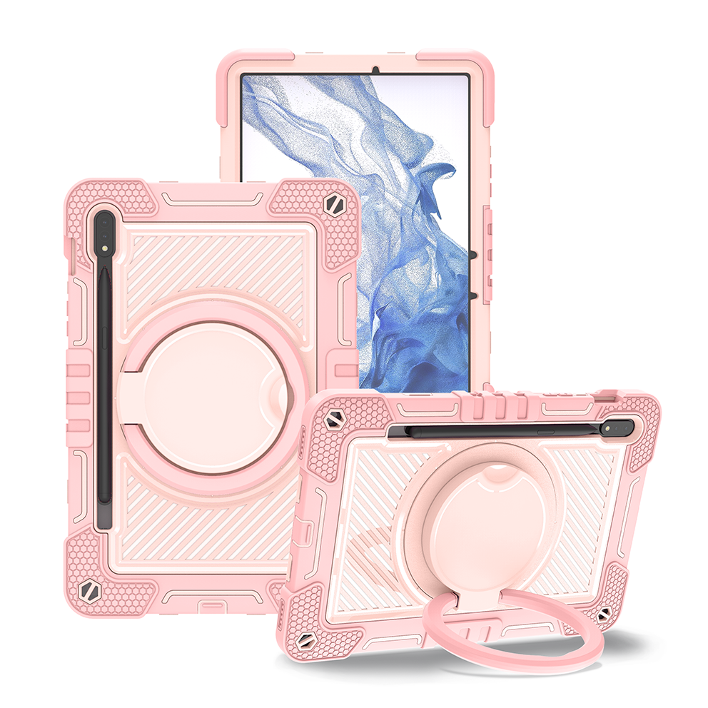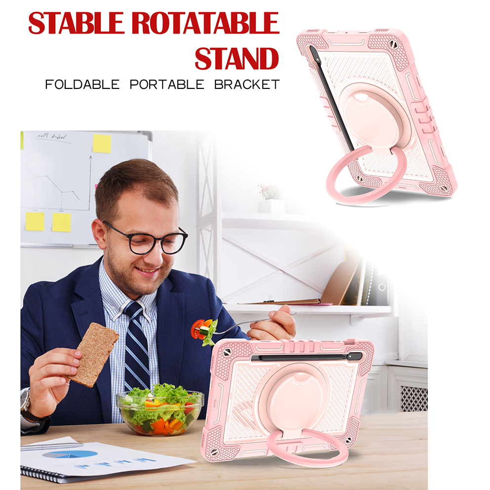 Chic pink rugged case for Samsung Galaxy Tab S7 11'', with 360° rotation grip stand, triple-layer silicone design, and child-safe protection.