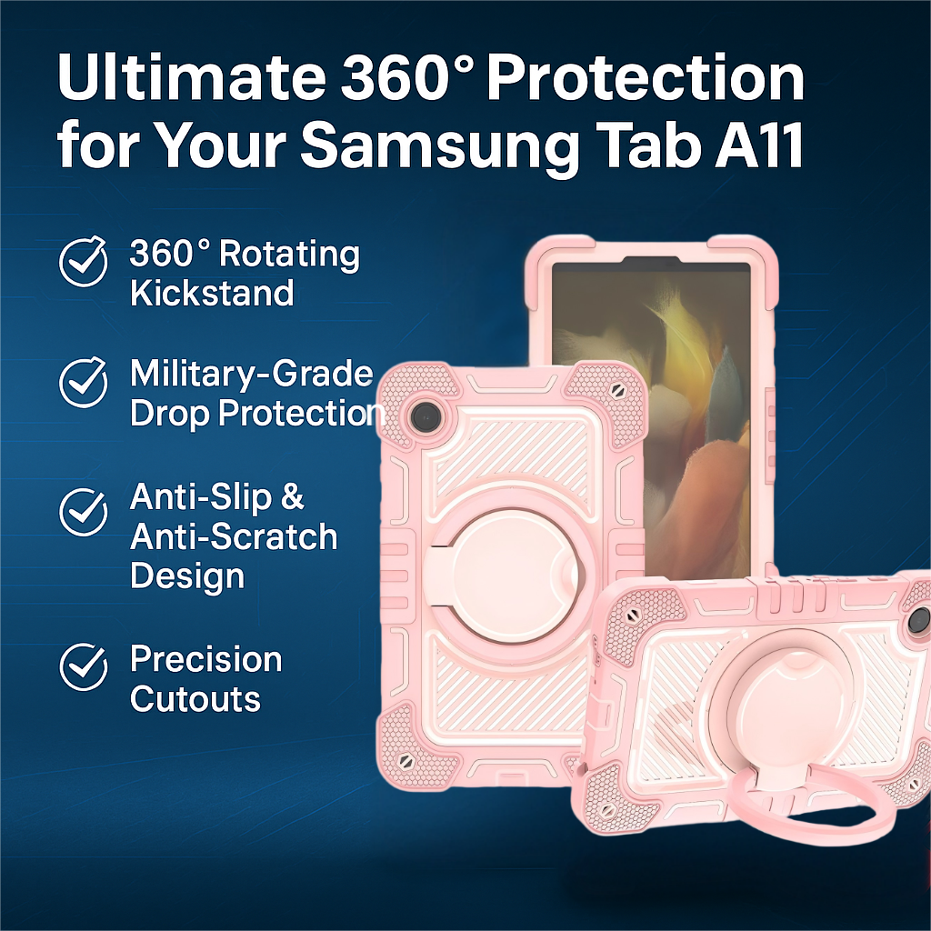 Stylish pink protective case for Samsung Tab A11 (2025) 8.7'', built with triple-layer defense and 360° rotatable kickstand grip.