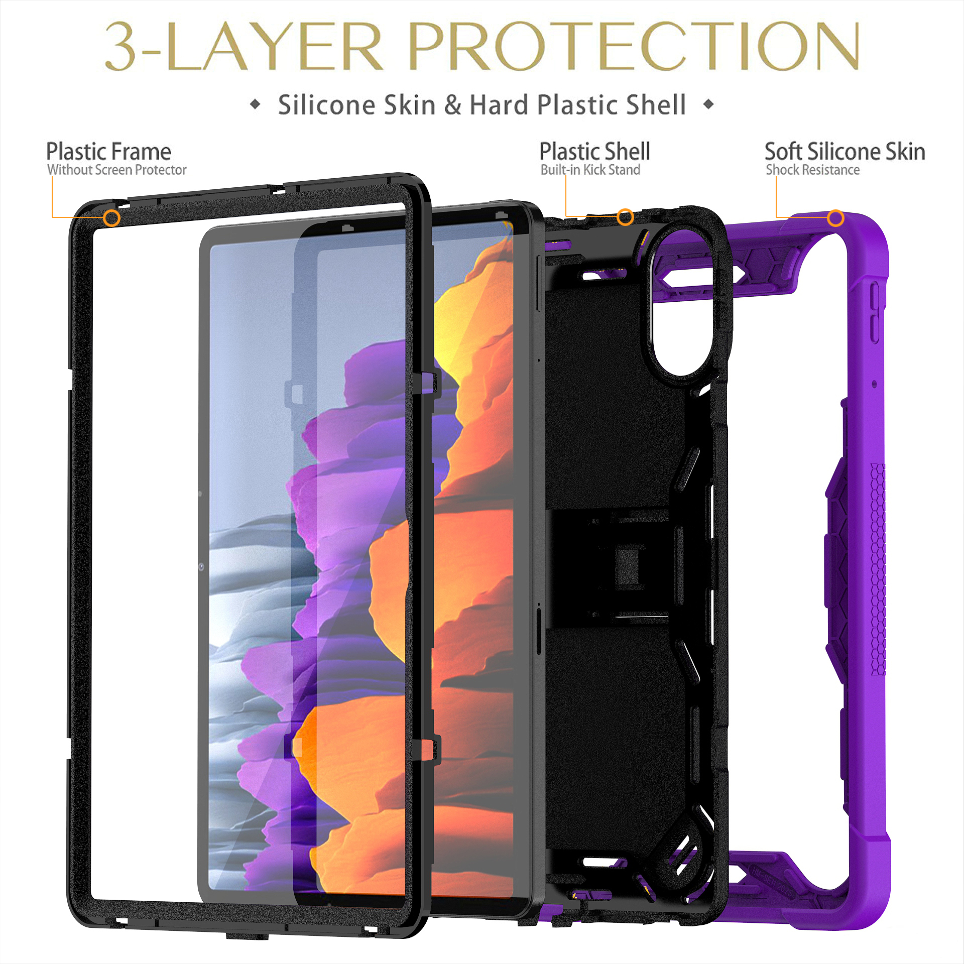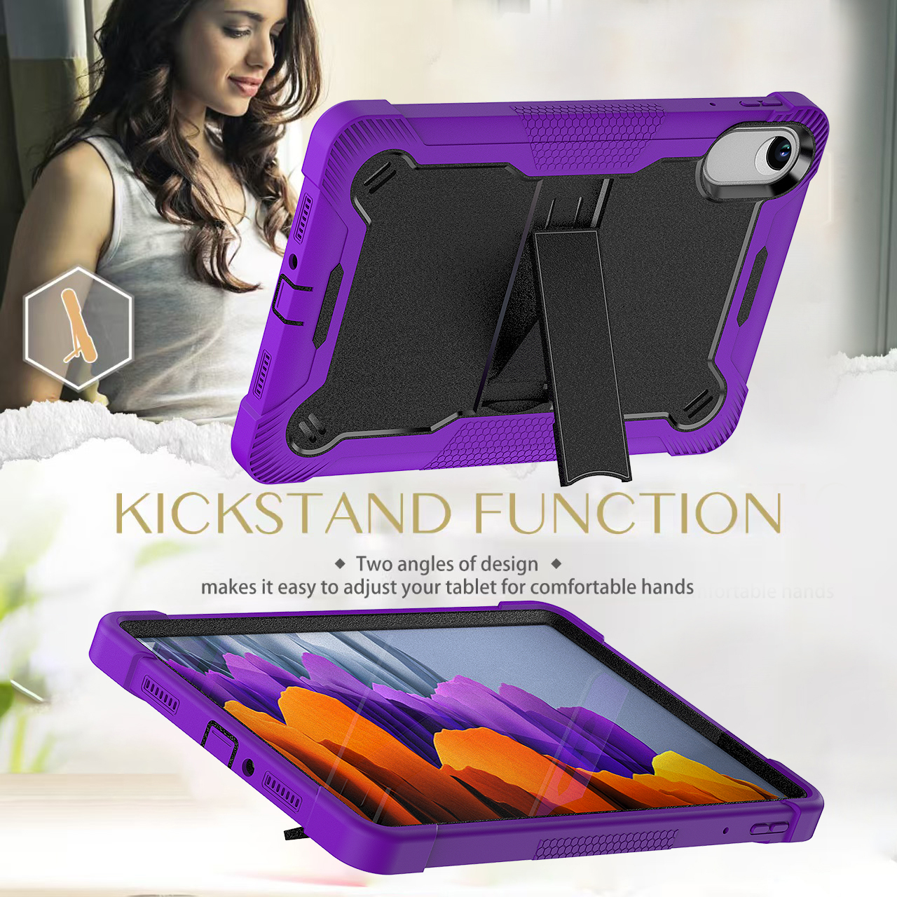 Featuring a bold purple design with reinforced corners and a tri-layer combo (silicone, PC), this case delivers industrial-level protection. A built-in stand offers convenience for meetings, classes, or video playback.