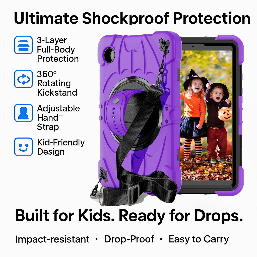 This purple kids tablet case features a 3-layer protective structure combined with a 360° rotating kickstand, offering dual protection for both learning and entertainment. Specially designed for classroom and home use, it is compatible with the Samsung Tab A11. As a Kid Education 3 Layers Heavy Duty Rugged Full-Body Protective Shockproof Tablet Case, it ensures reliable drop resistance and functionality for daily use.