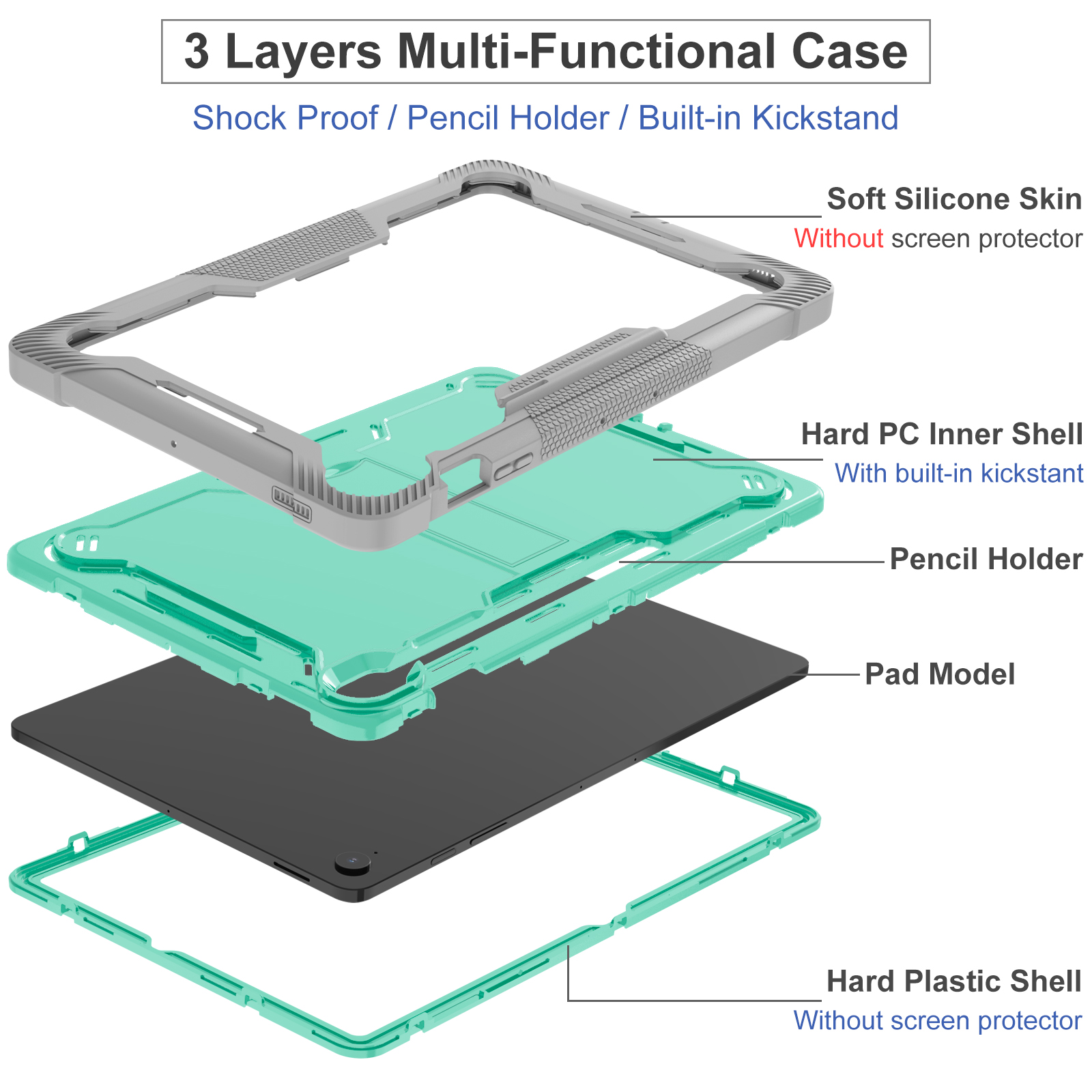 • This Heavy Duty Shockproof Silicone Case for Samsung Galaxy Tab S10 FE Plus/X620/X620B 13inch is an amazing, multifunctional case that protects your brand-new Pad at all costs. The heavy-duty case even has a pencil holder and a built-in kickstand for your convenience.