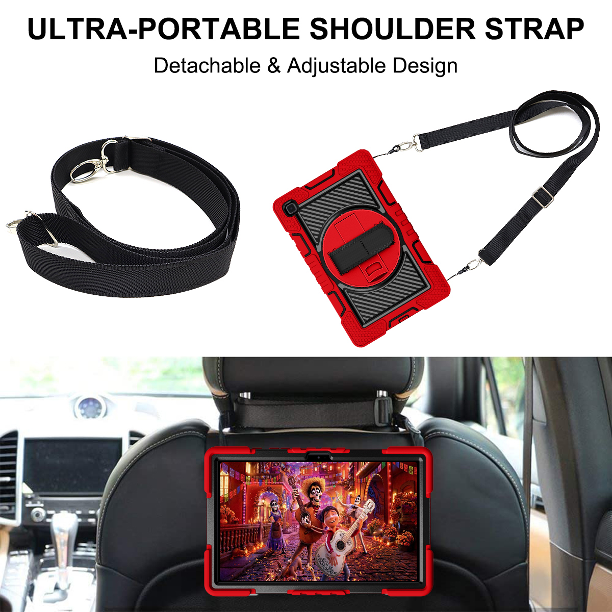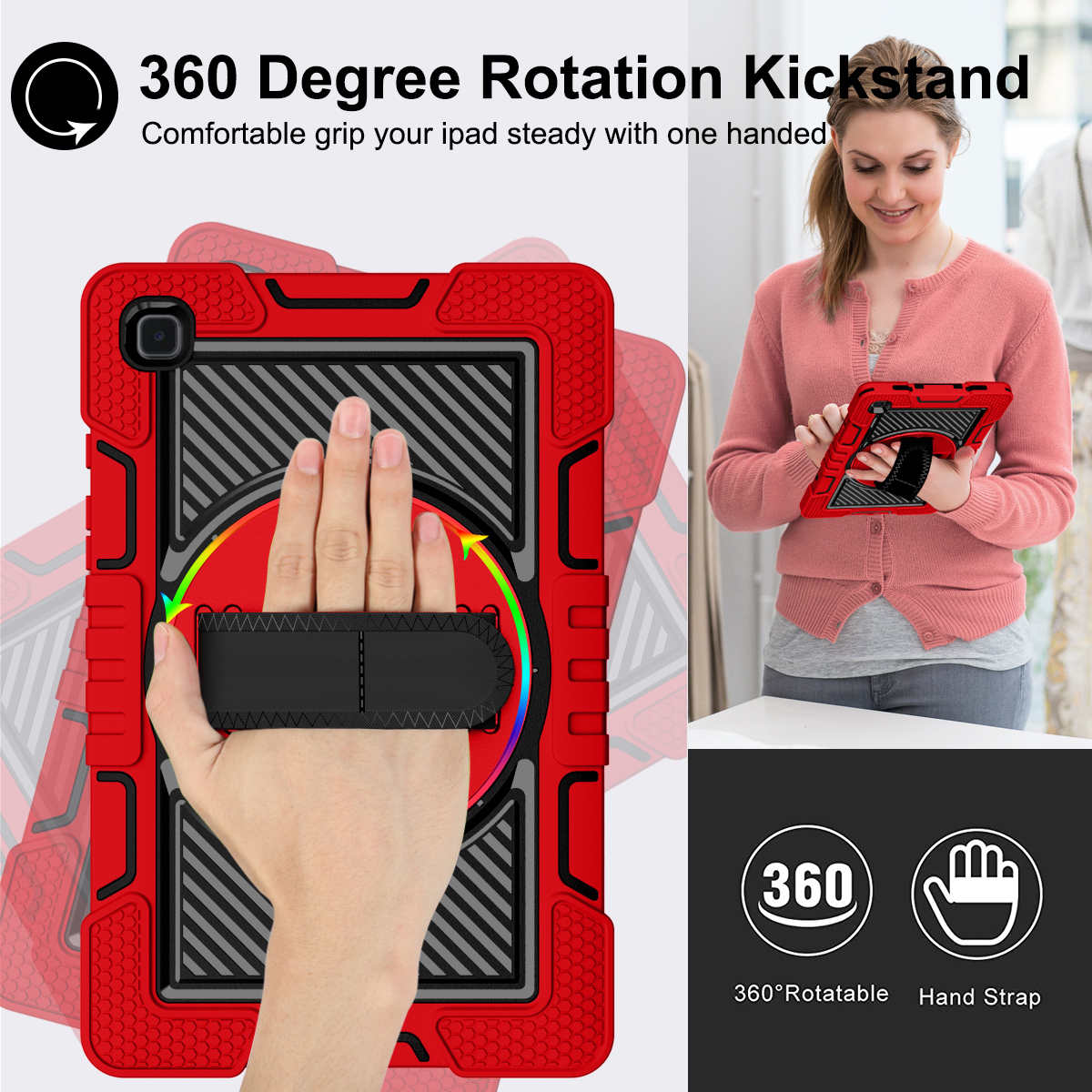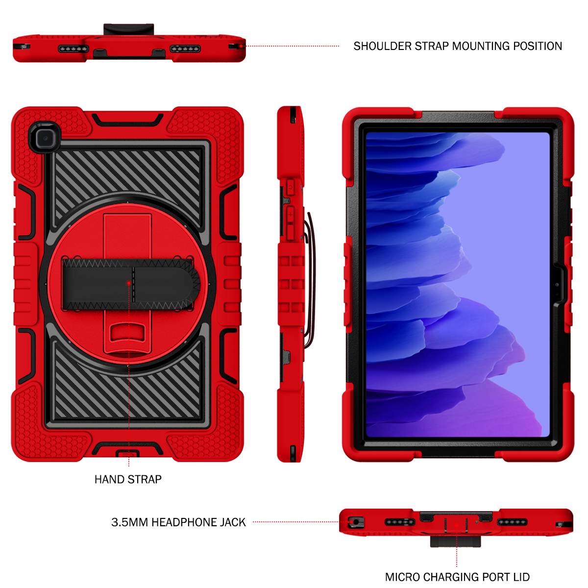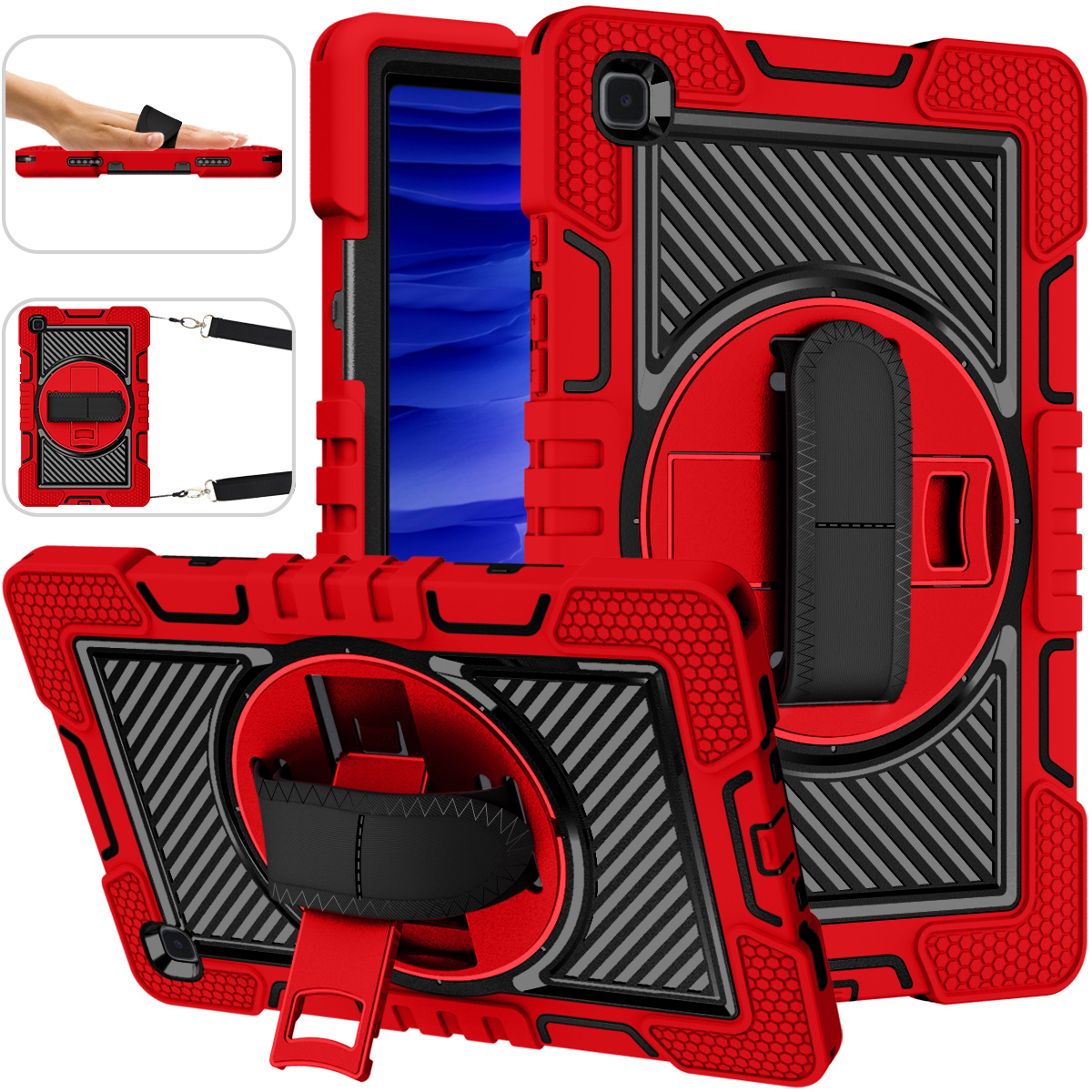The Red & Black Galaxy Tab A7 rugged case delivers maximum protection with style. Its 360° kickstand, shockproof shell, and carrying strap system make it perfect for students, kids, teachers, and anyone who needs tough tablet protection.