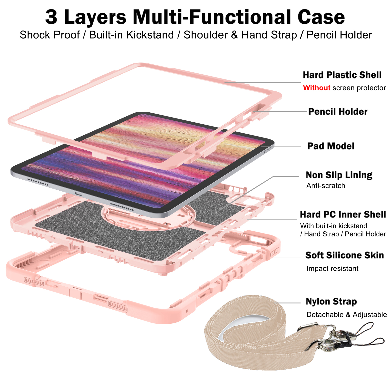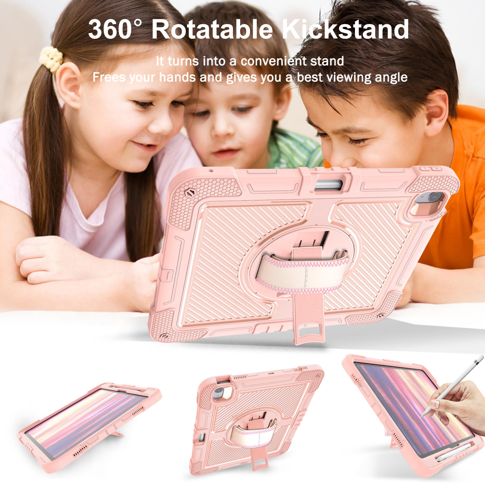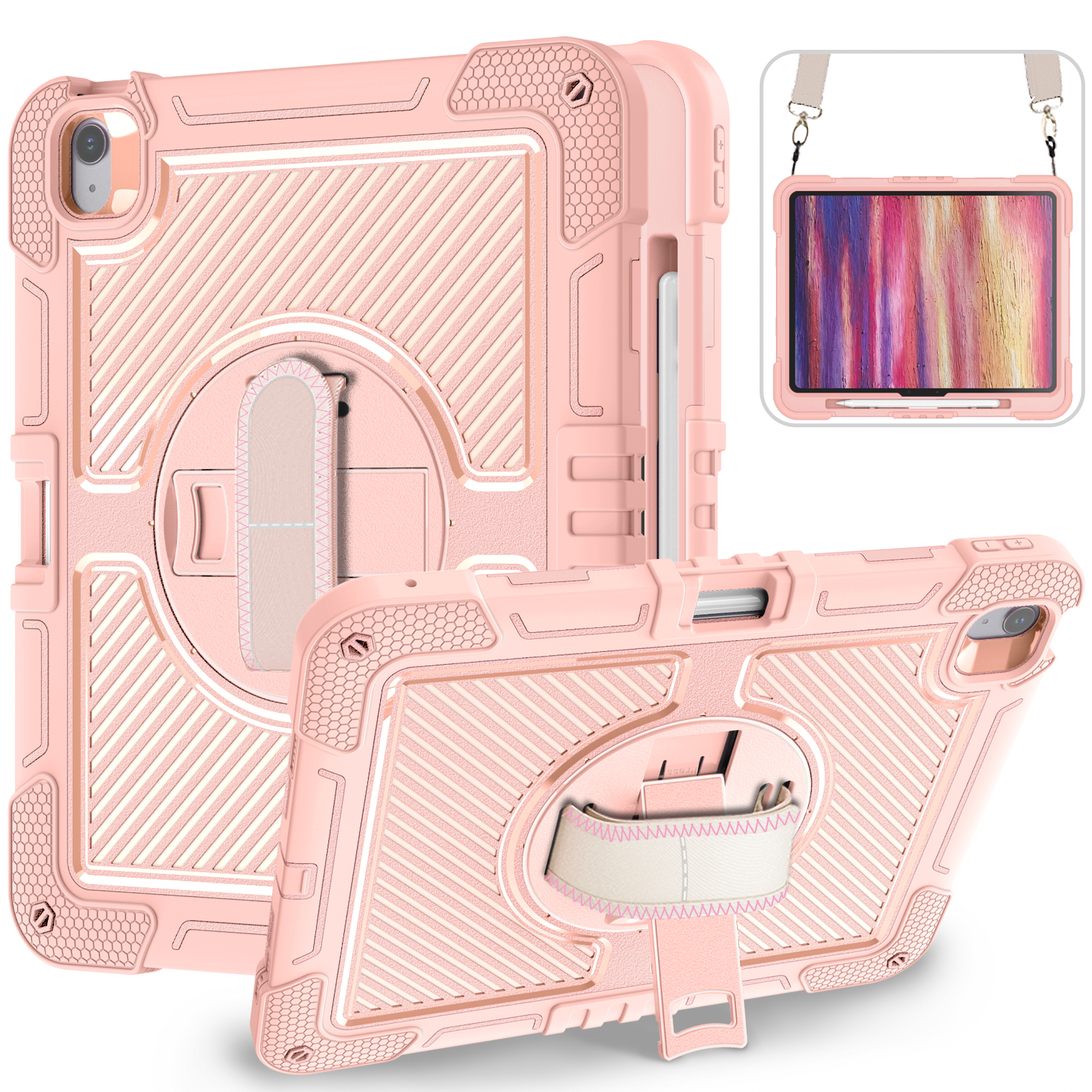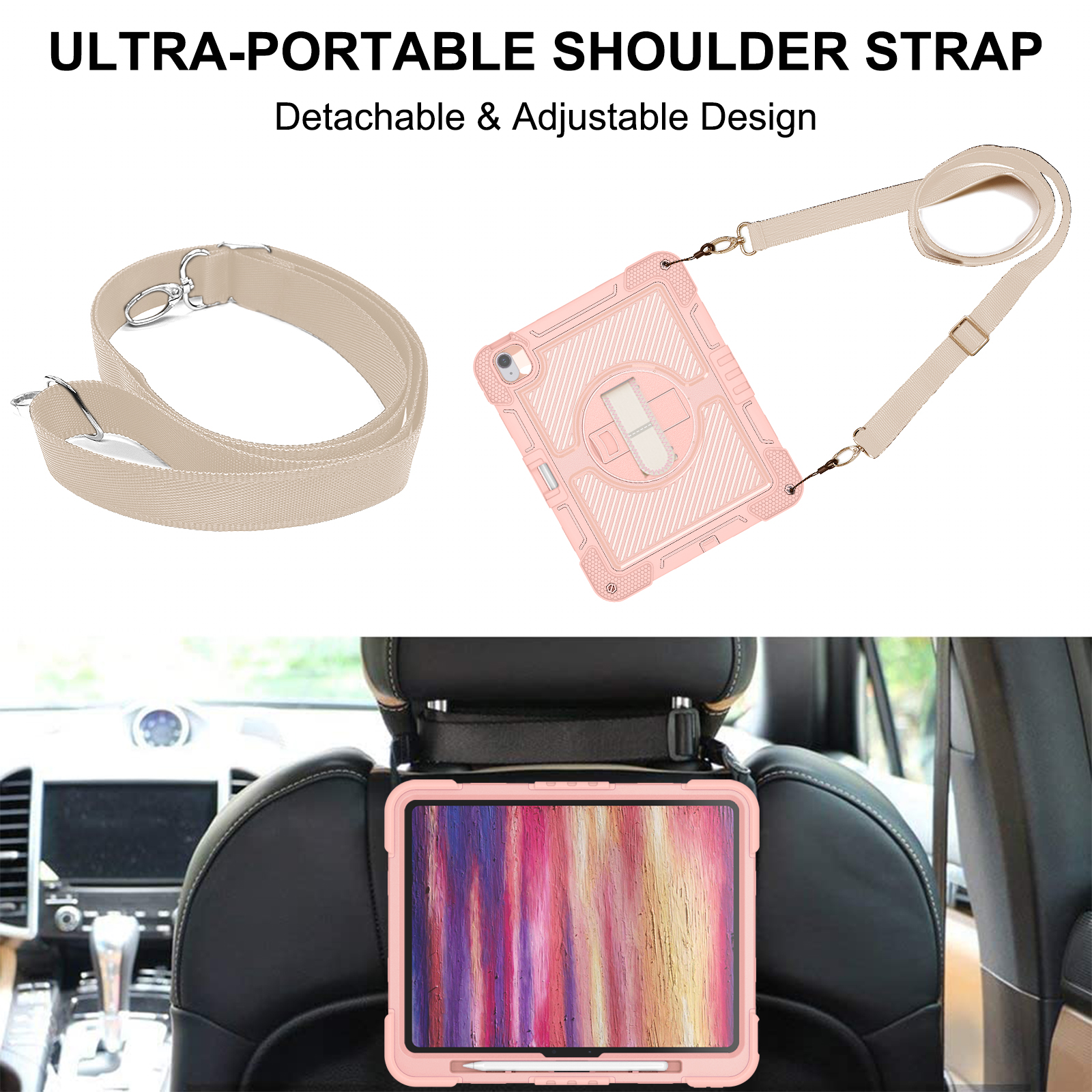 Soft pink rugged iPad Air 13 (2024) case with shockproof layers, 360° stand, hand strap and detachable shoulder strap for girls and students.