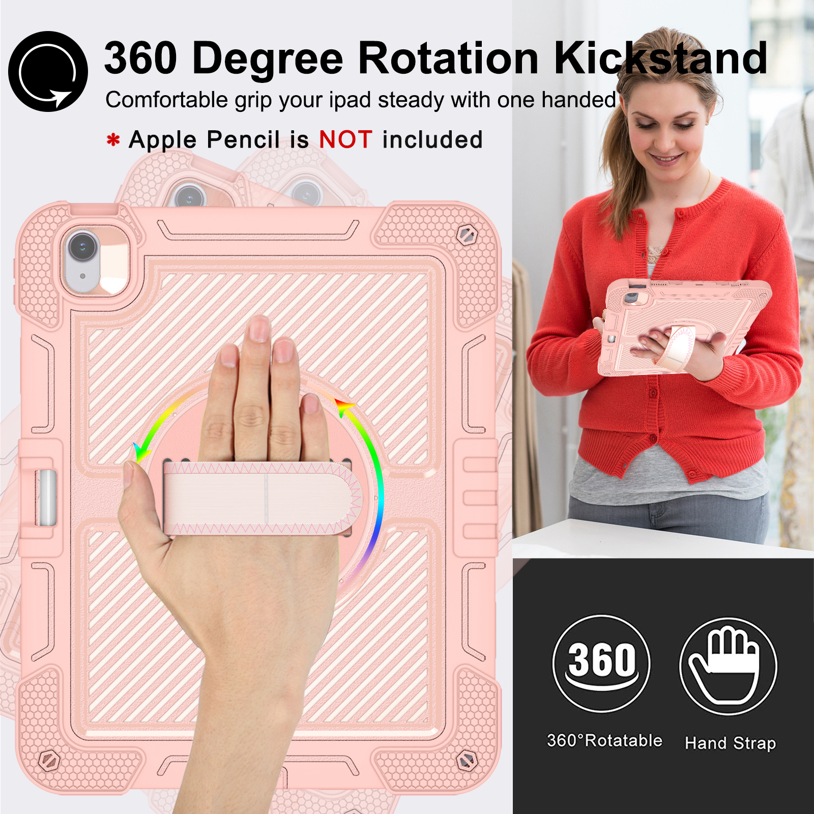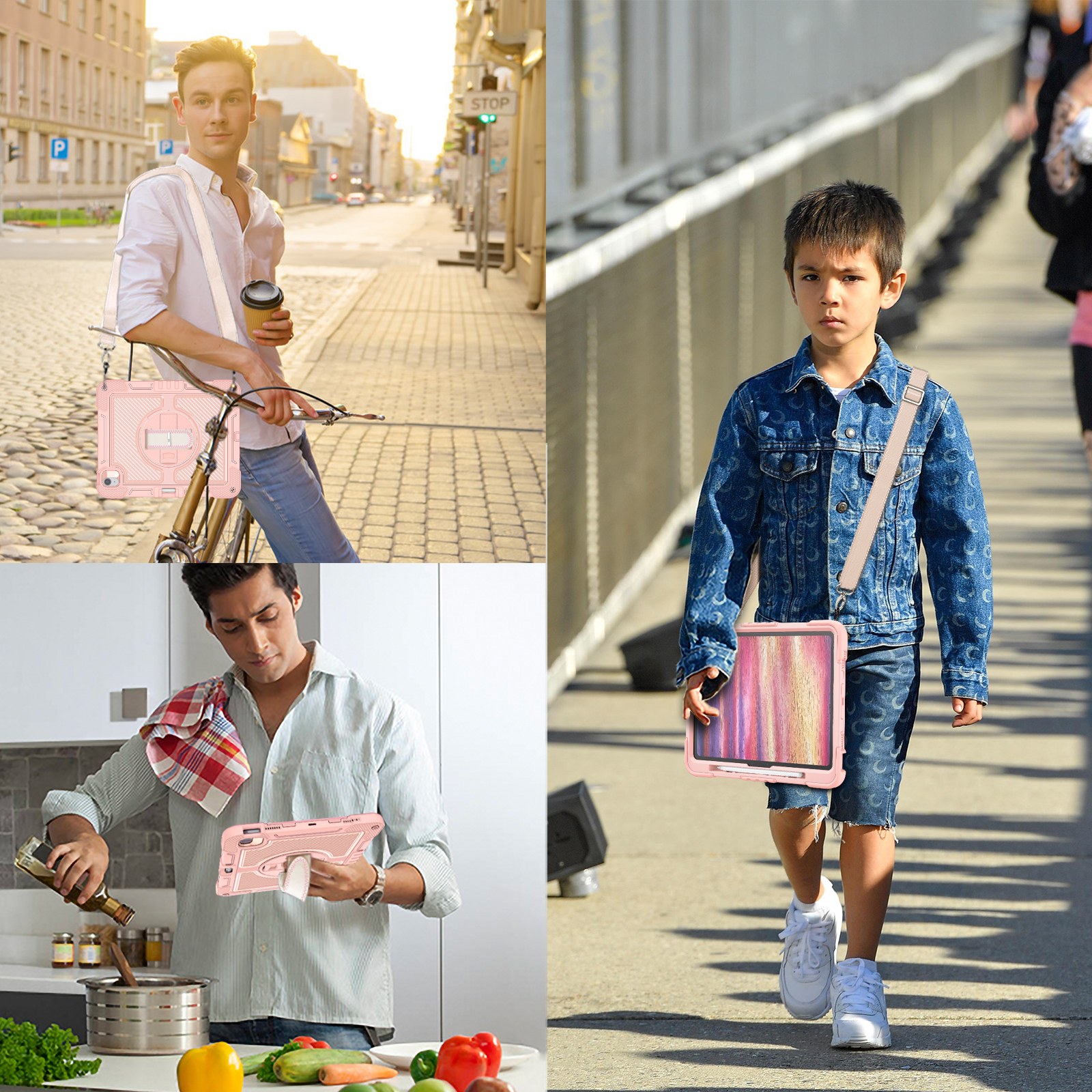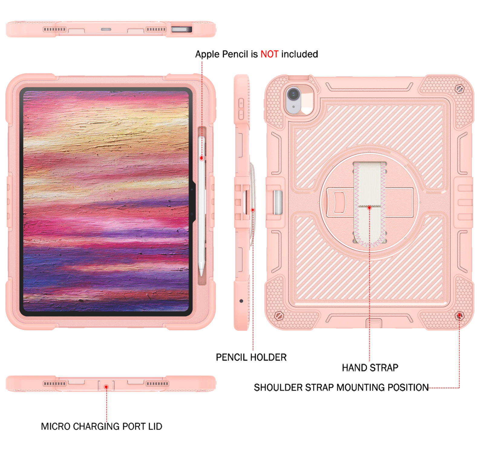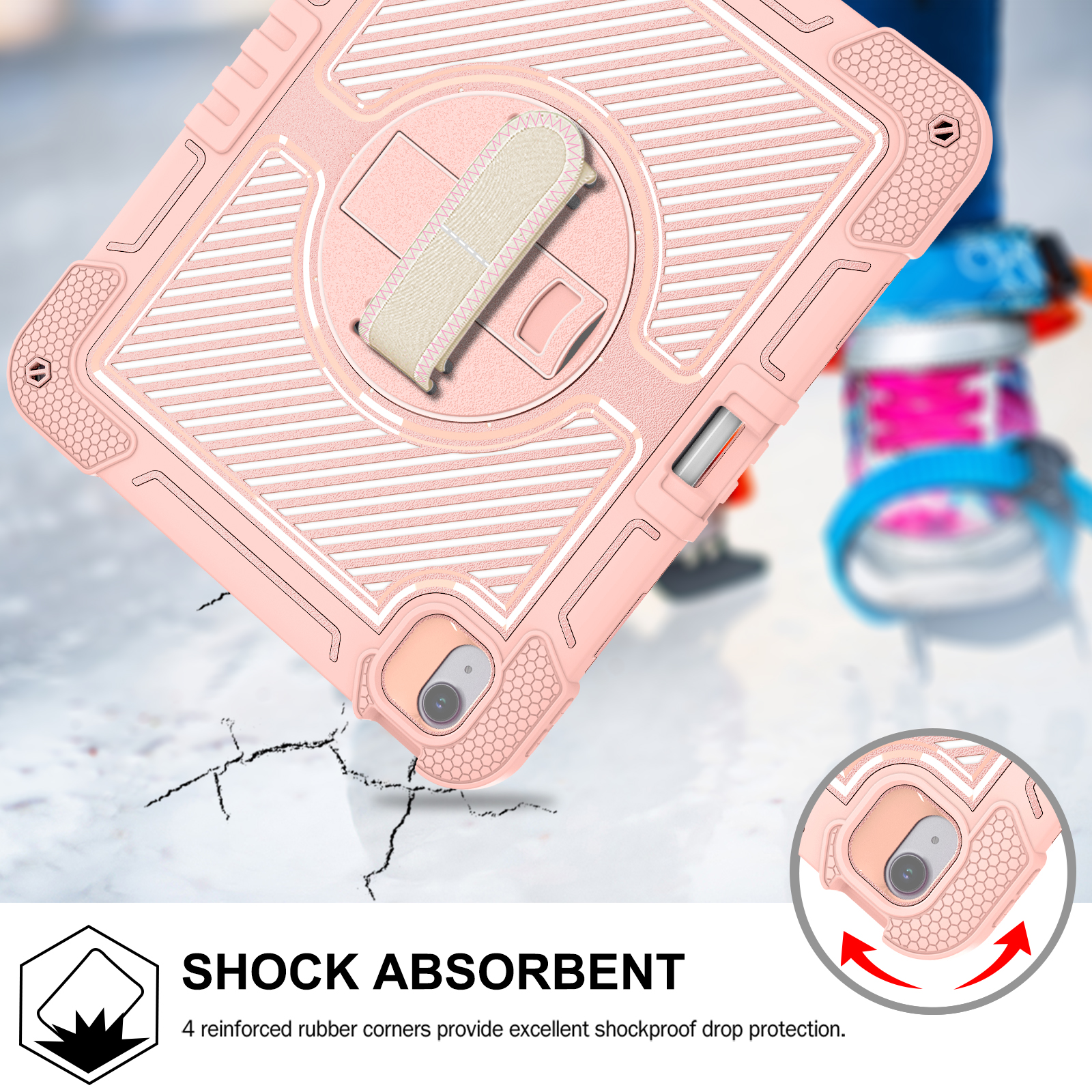 Soft pink rugged iPad Air 13 (2024) case with shockproof layers, 360° stand, hand strap and detachable shoulder strap for girls and students.