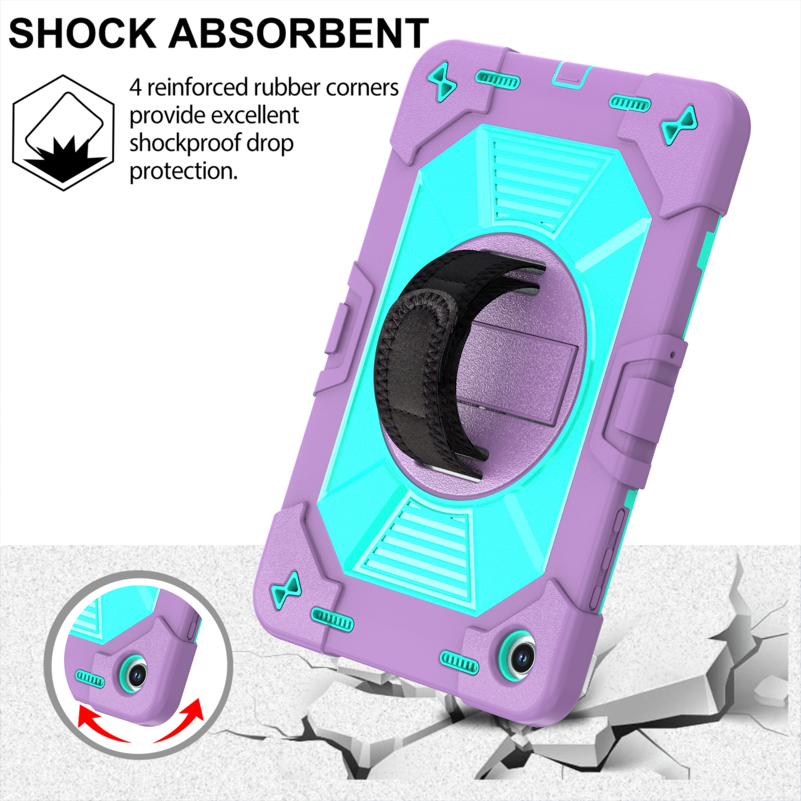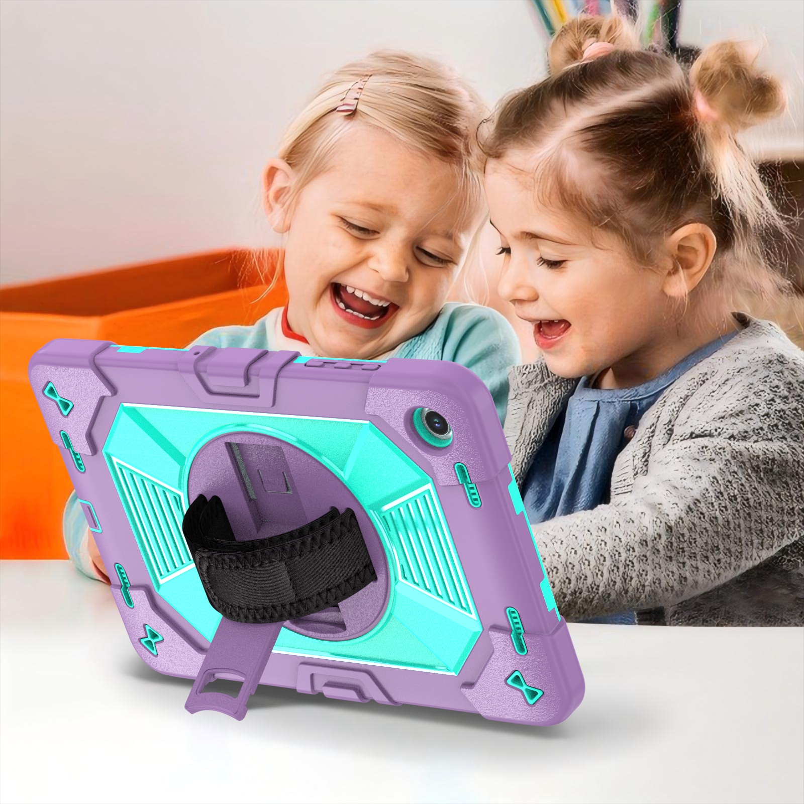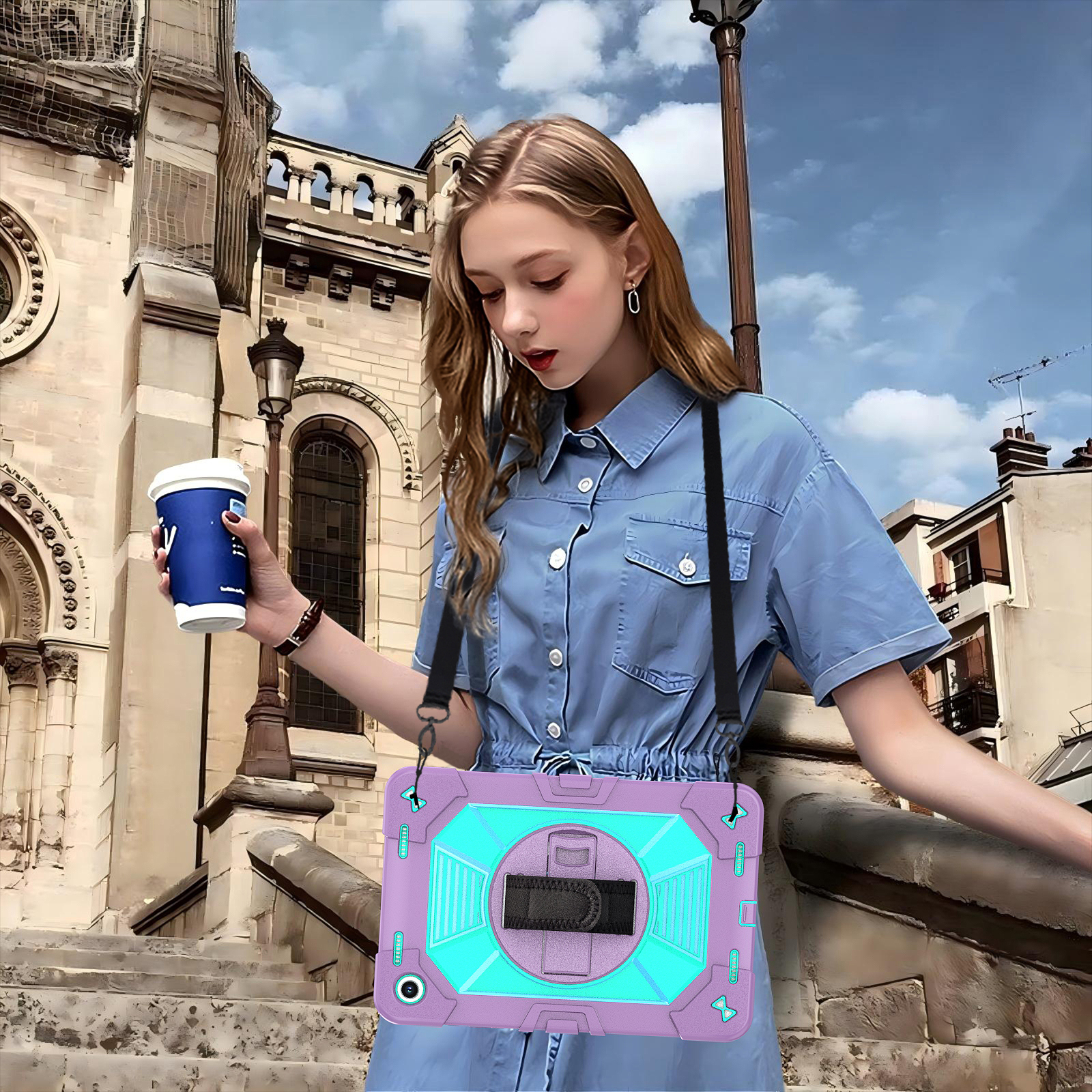 Teal purple heavy-duty kids tablet case with 360° swivel stand, hand grip, and shoulder strap for secure protection and flexible viewing.