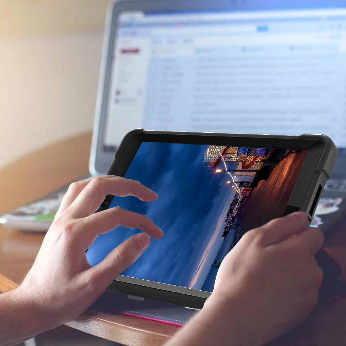 The rugged build guarantees protection against shock, drops, scratches, dust, and more! On top of that, this case is undeniably stylish. It has a sleek and slim design that is comfortable to grip, with precise cutouts to completely access the ports, speakers, and buttons.