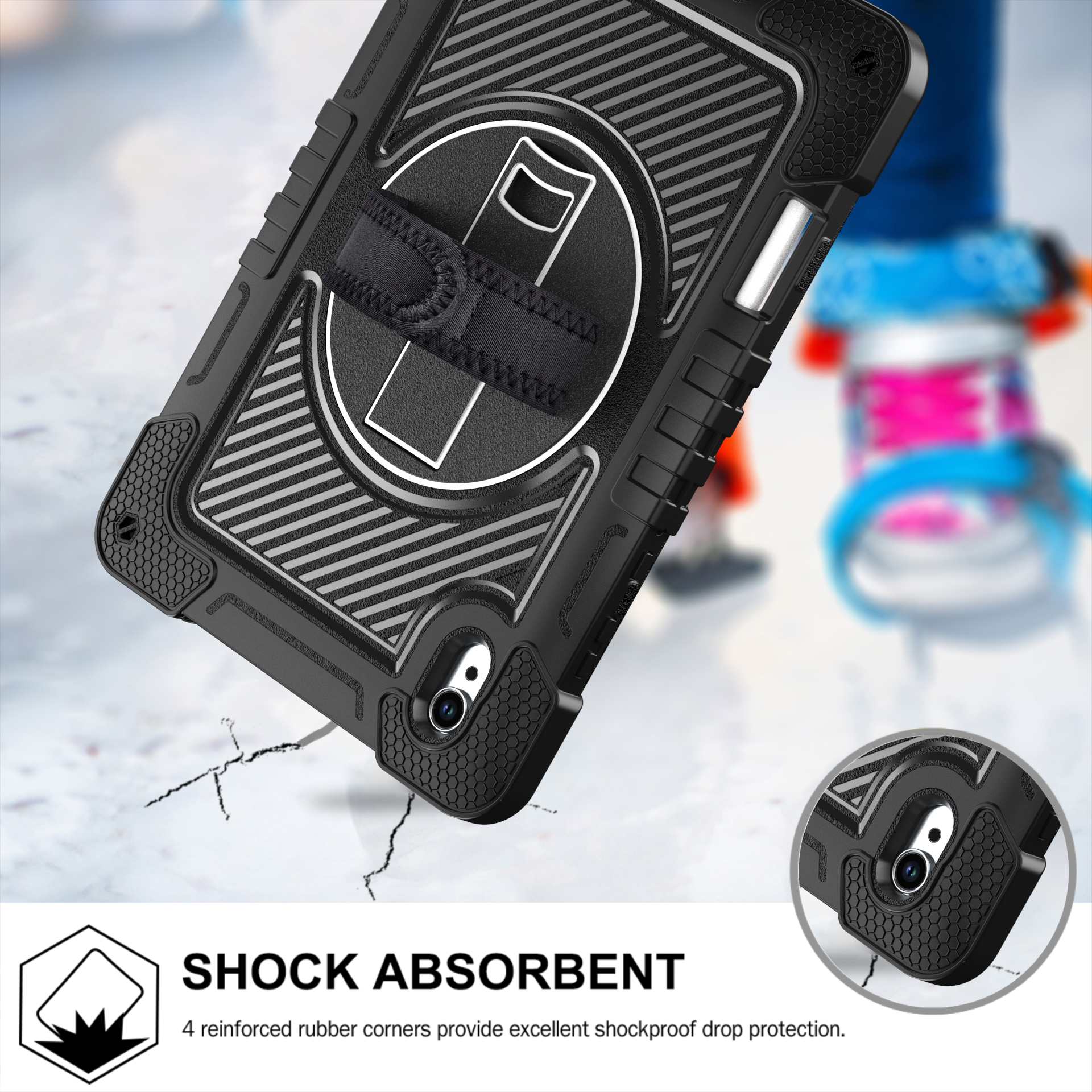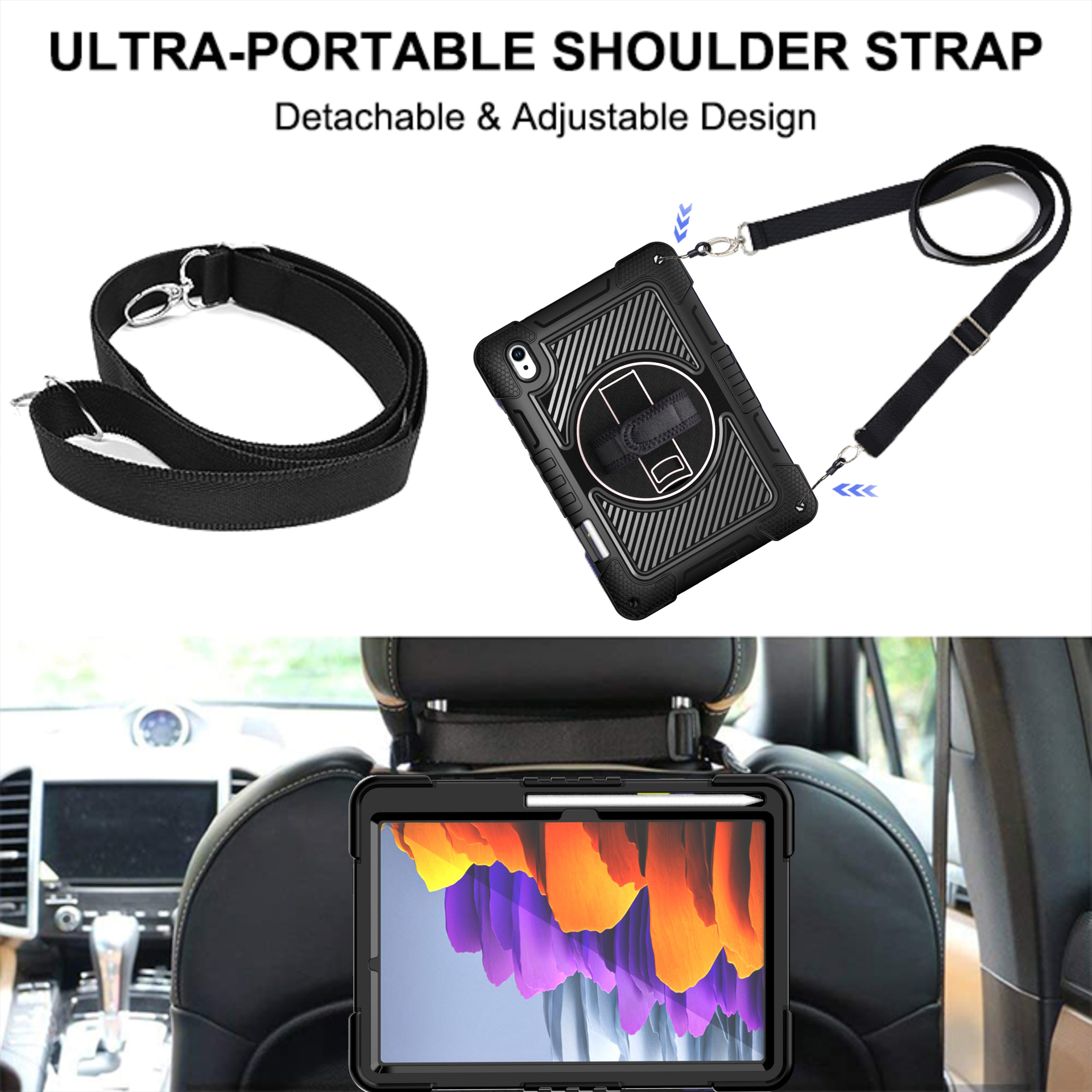 All-black heavy duty protective case for Samsung Tab S11. Features 360° kickstand, adjustable straps, and shockproof triple-layer design.