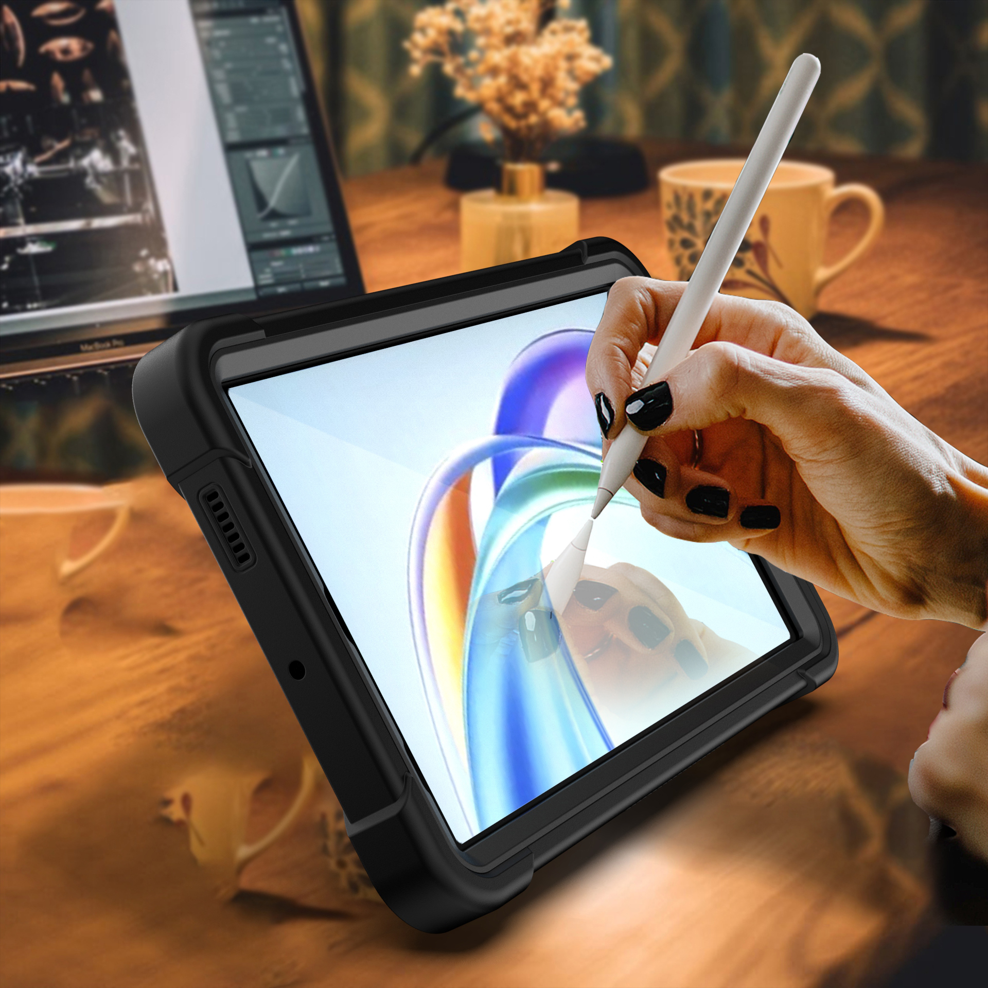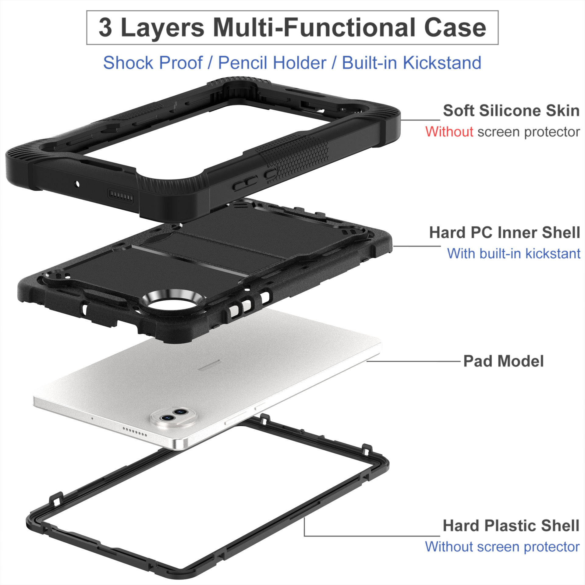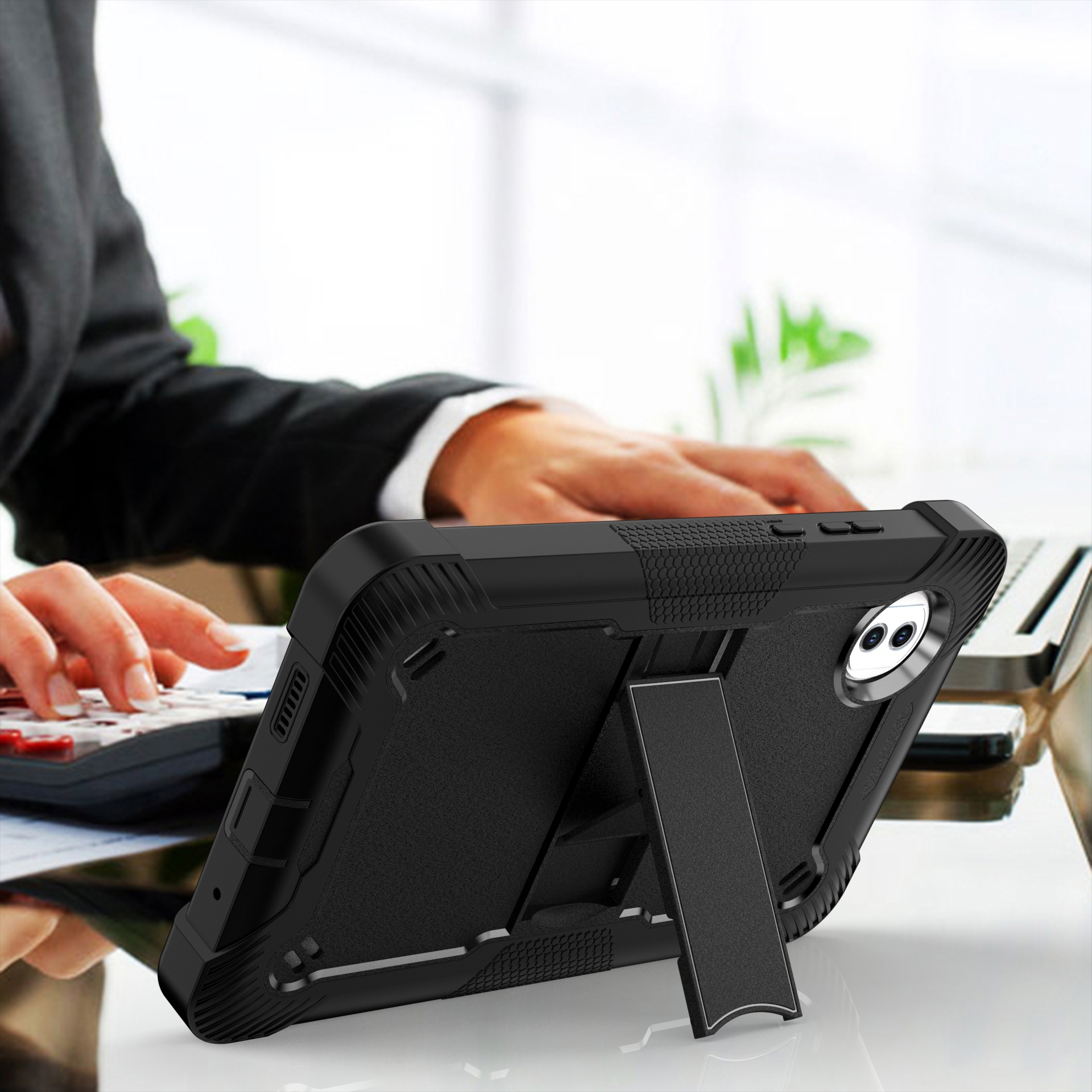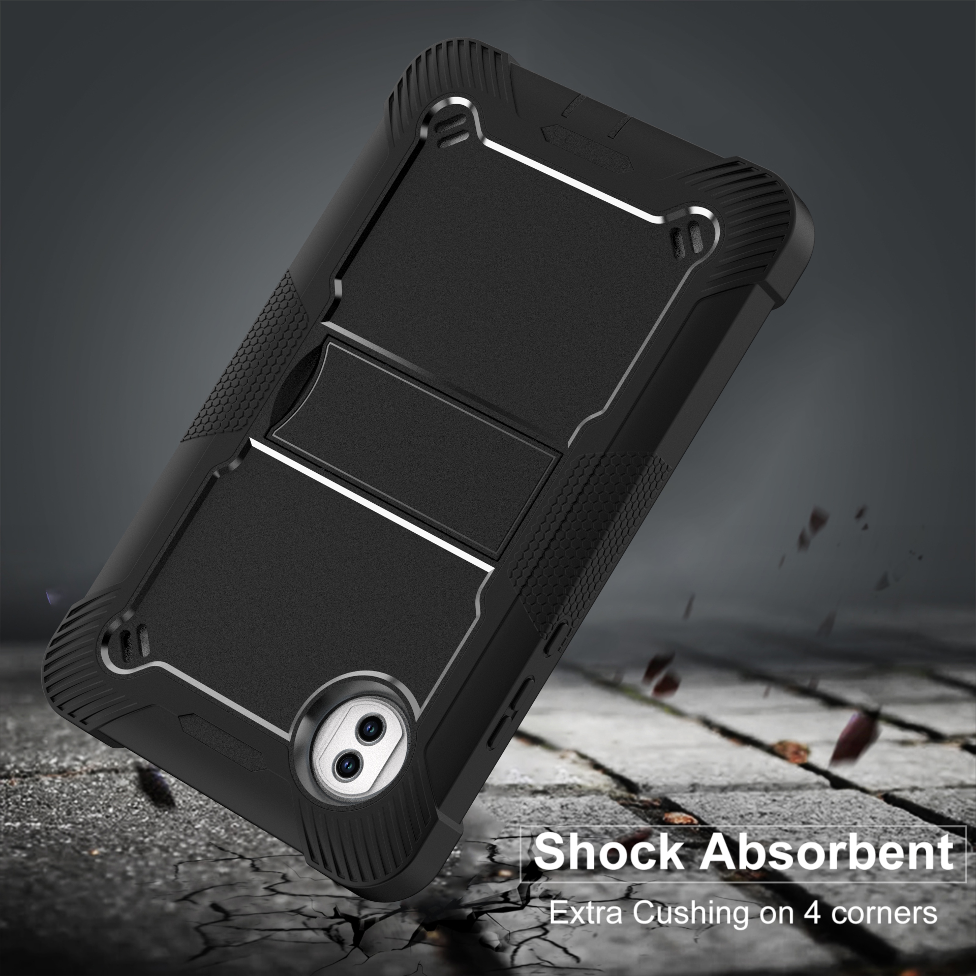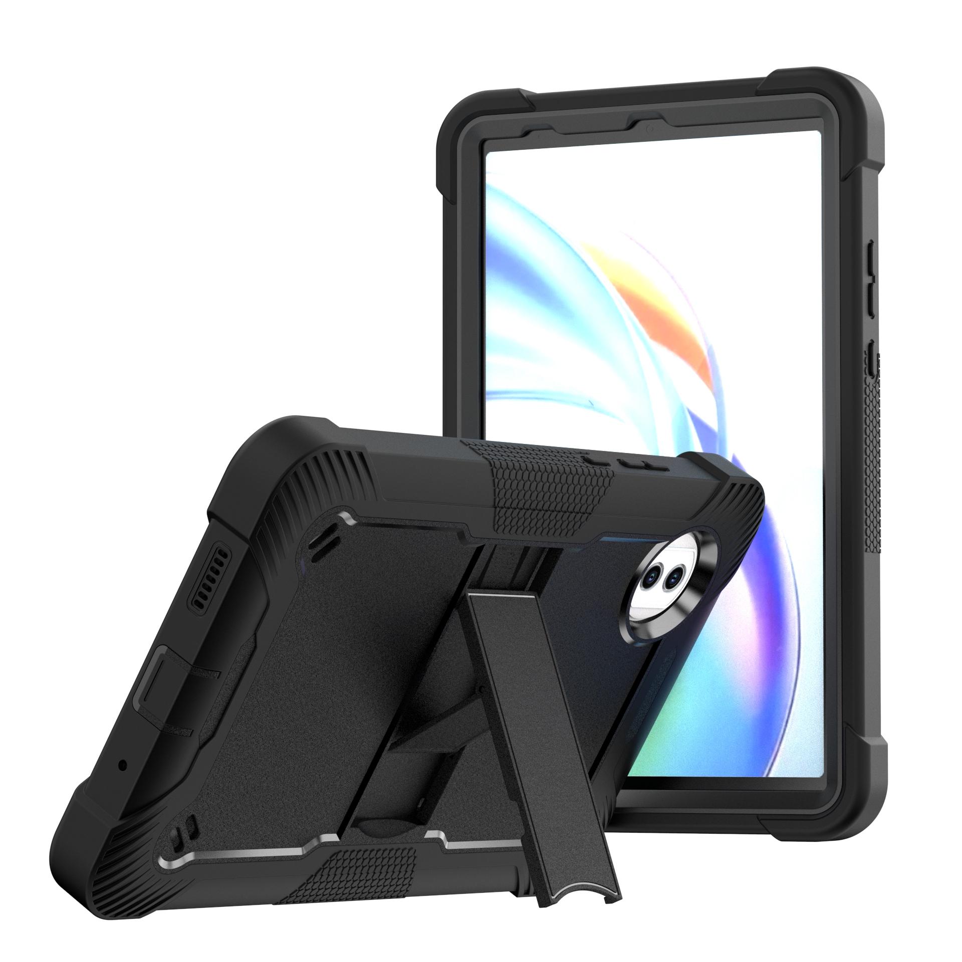 Heavy-duty black tablet case for Honor Pad X7 with triple-layer silicone + PC construction. Designed for school, work, or travel with military-grade drop protection and secure stand.