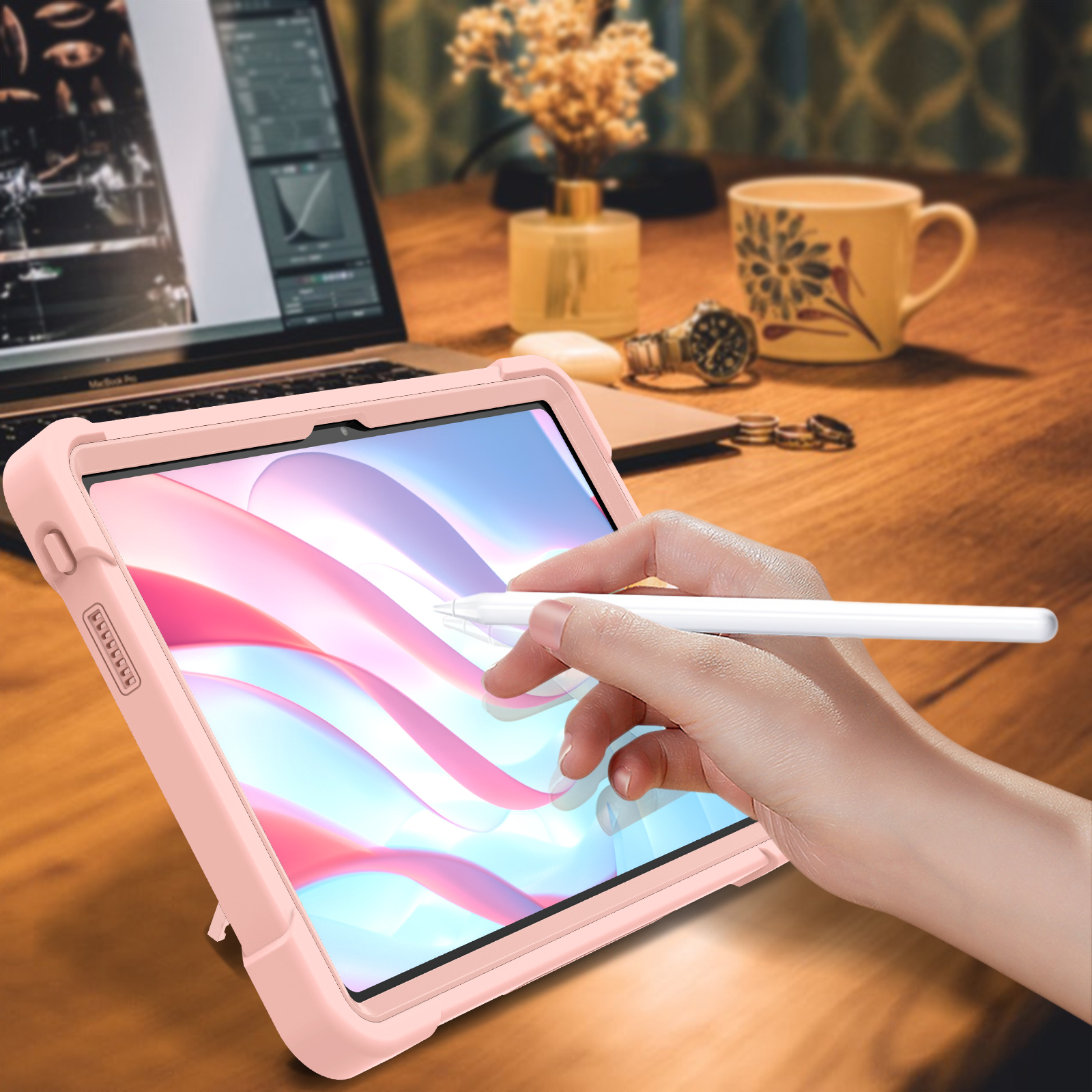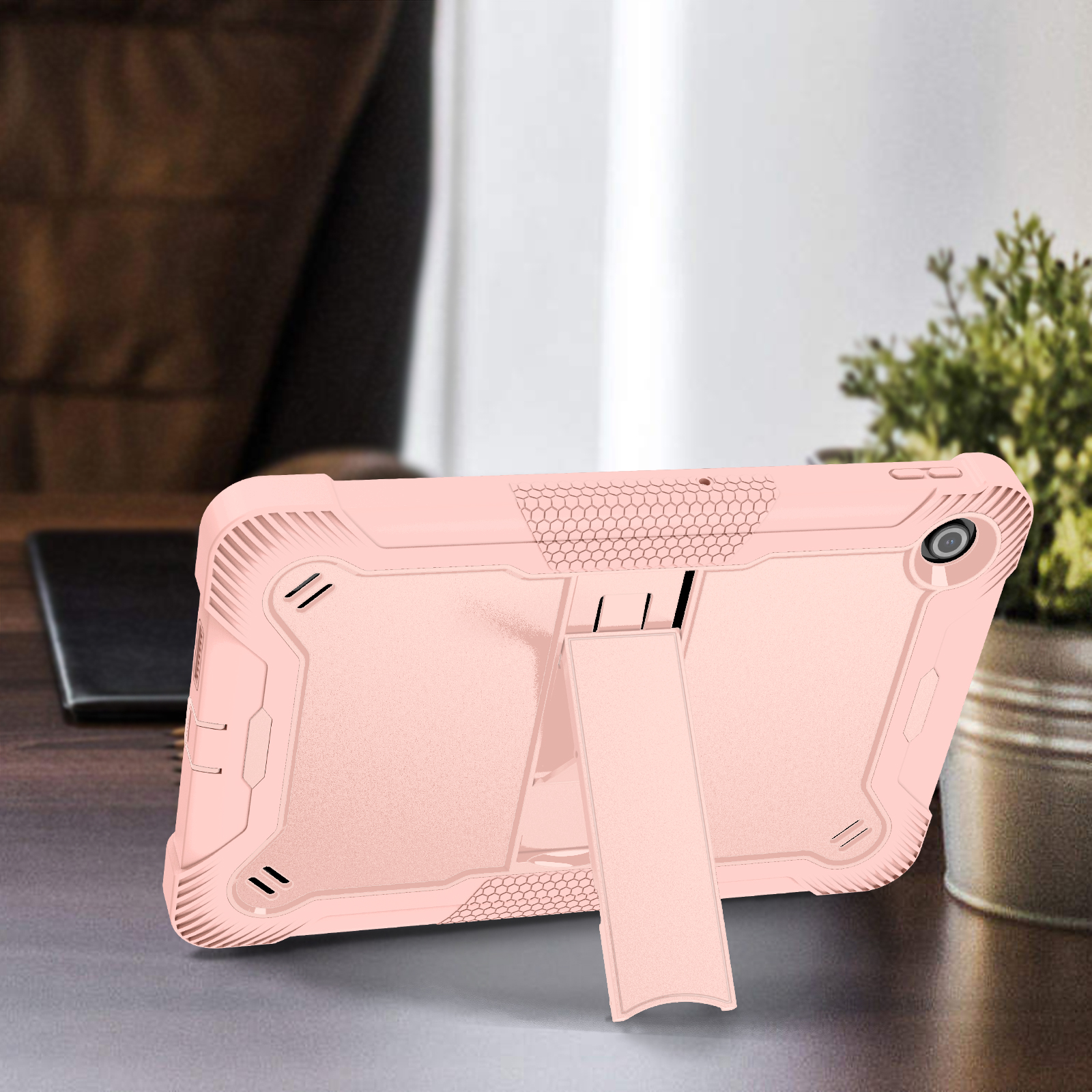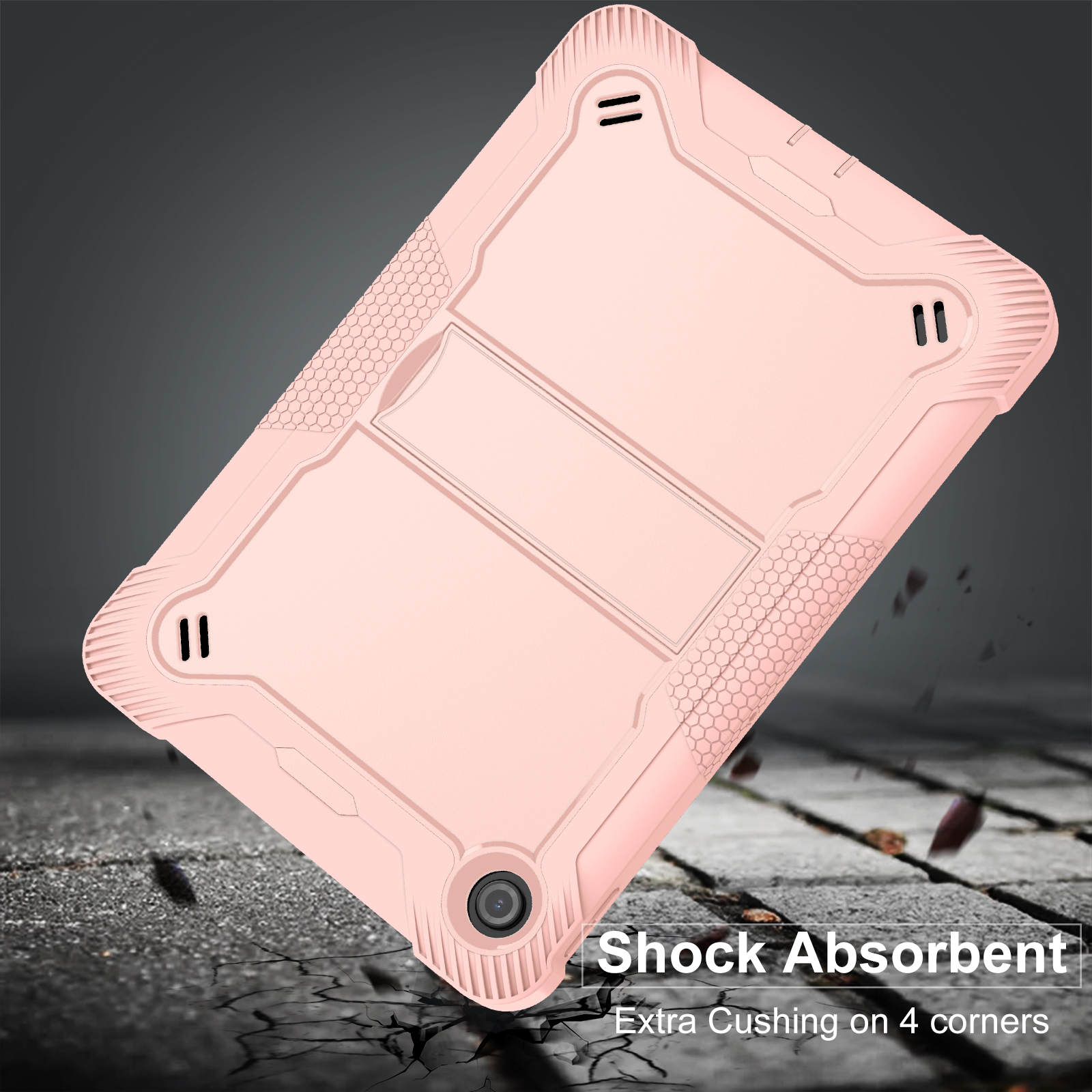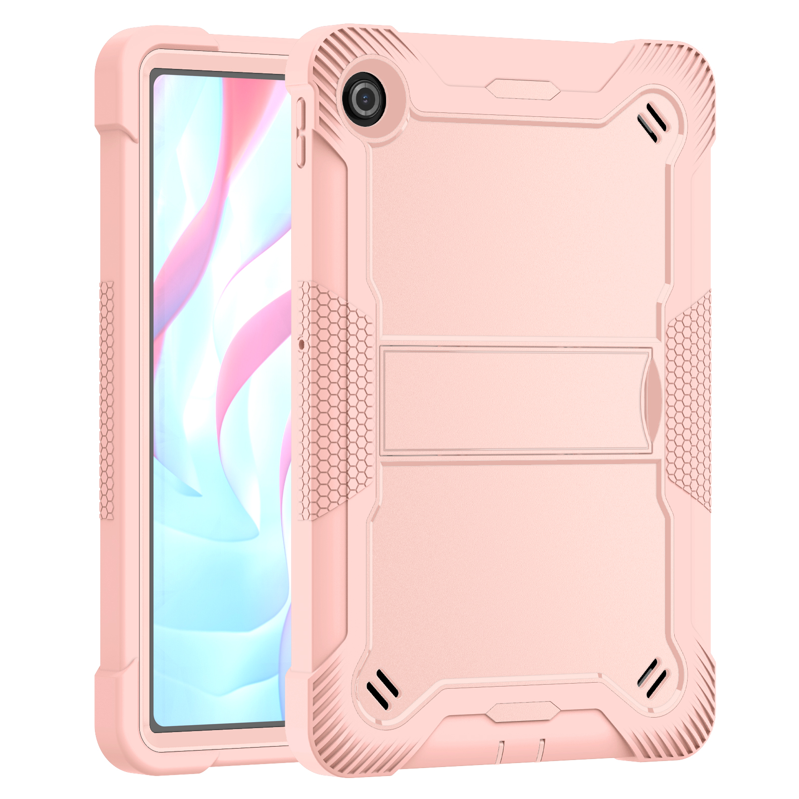 Soft in tone, tough in defense. This light pink Lenovo Tab case combines rugged silicone construction with drop protection, built-in stand, and a friendly design for children.