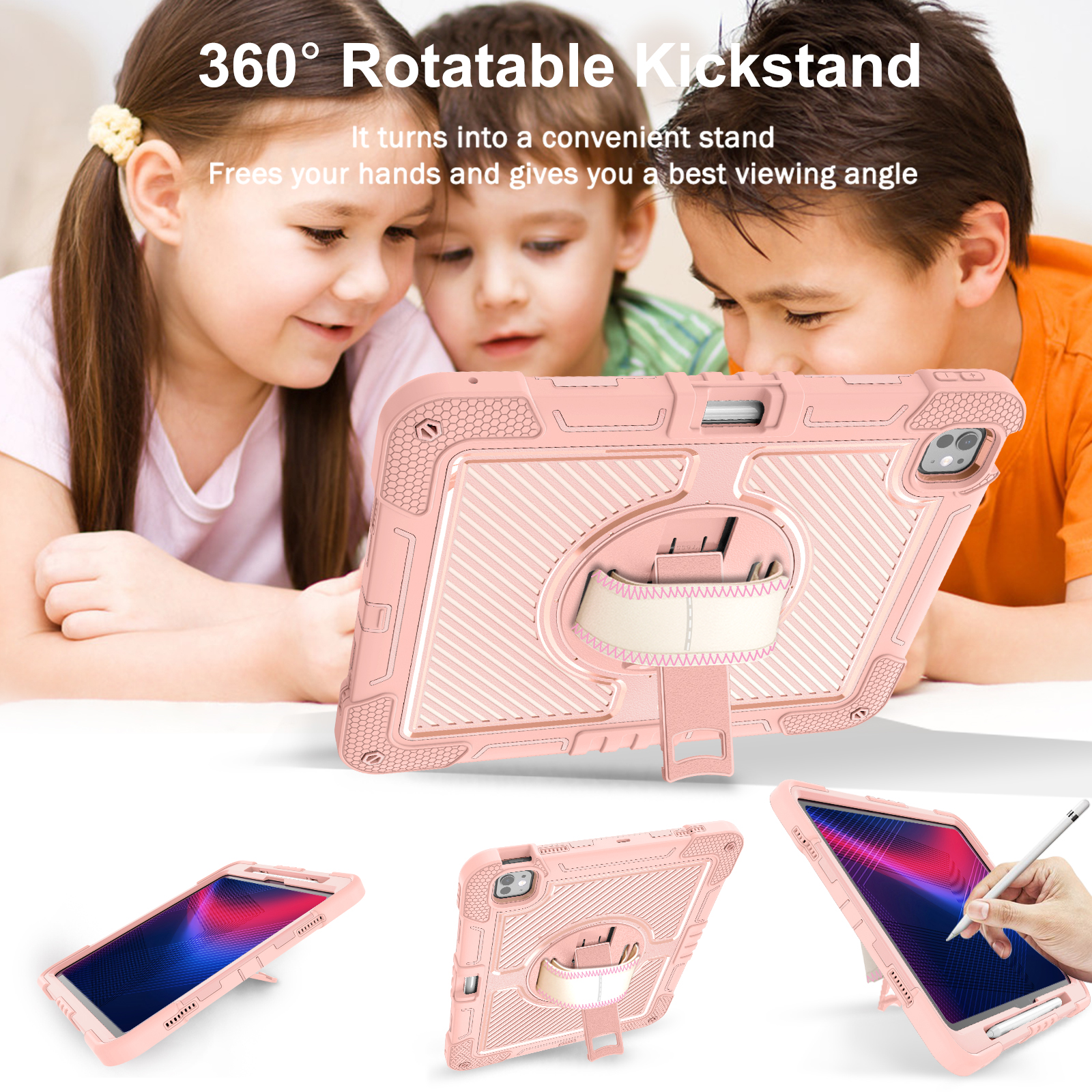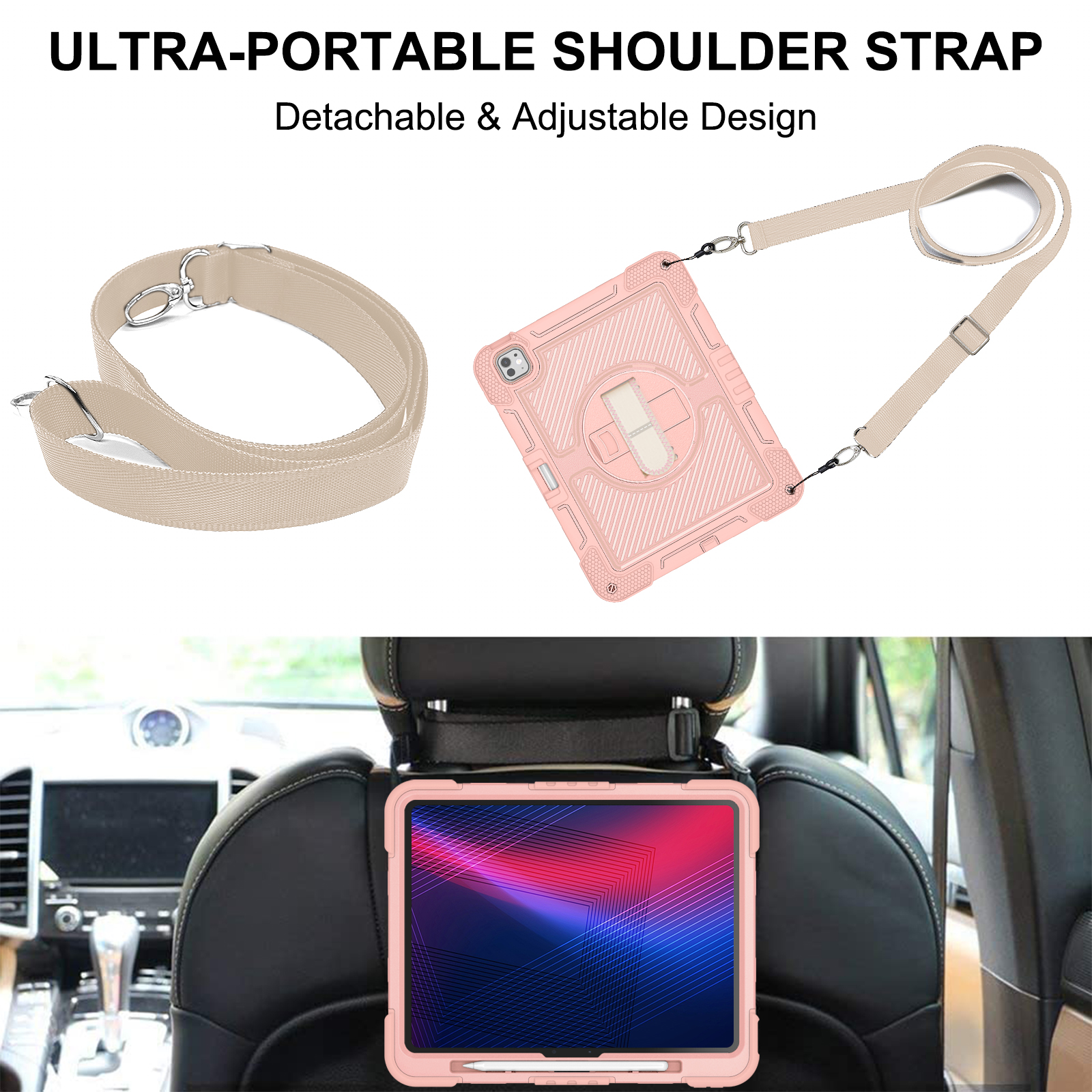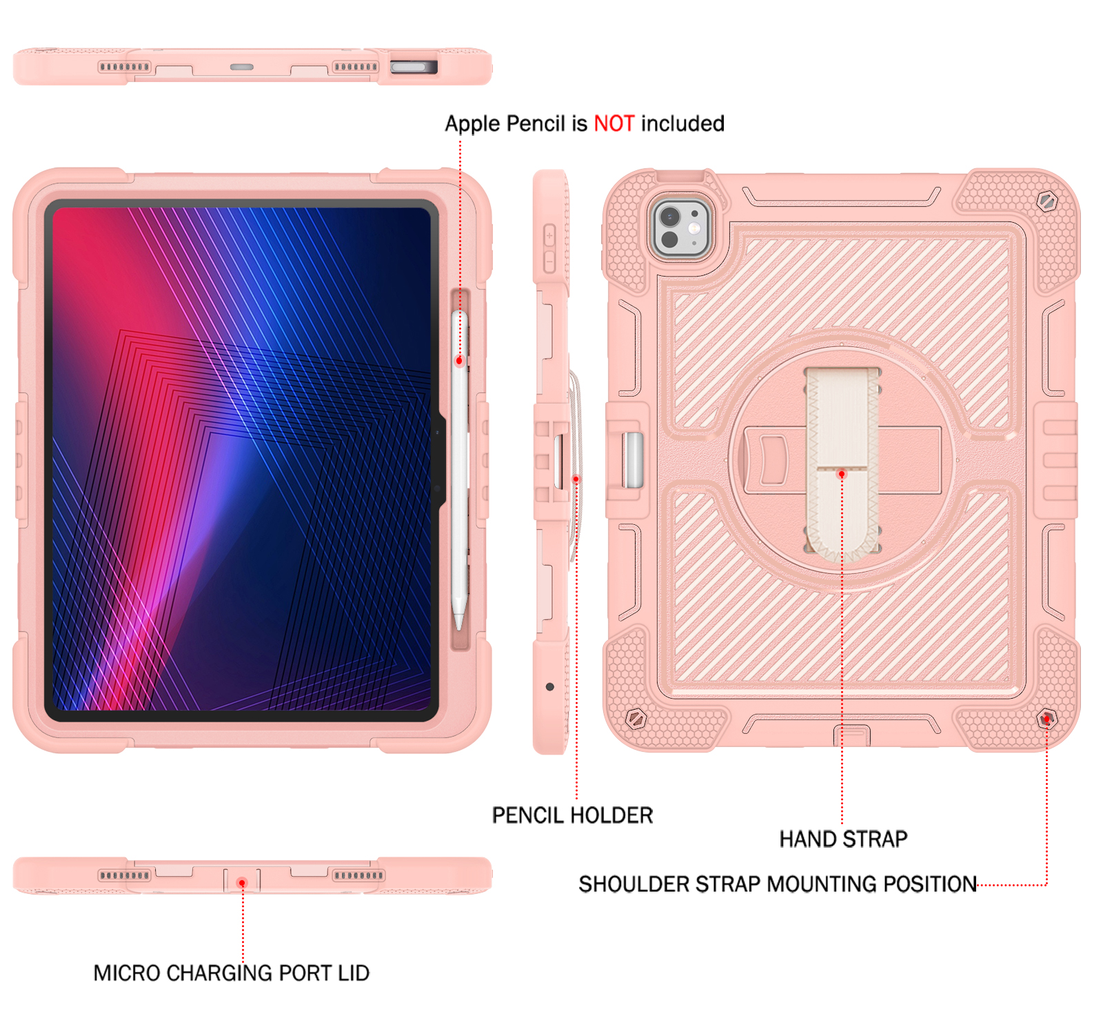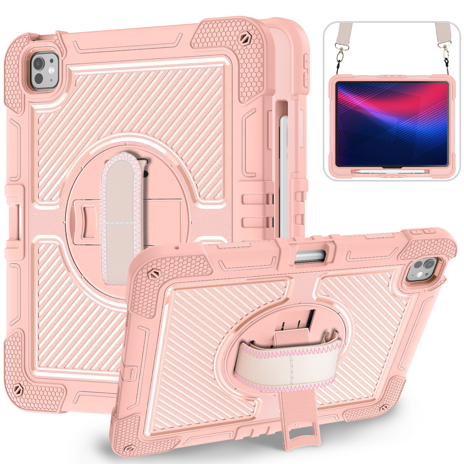 Delicate yet durable pink silicone case for iPad Pro 13" (2024), featuring triple-layer shockproof protection, a 360° rotatable kickstand, hand strap, and shoulder strap for education or family use.