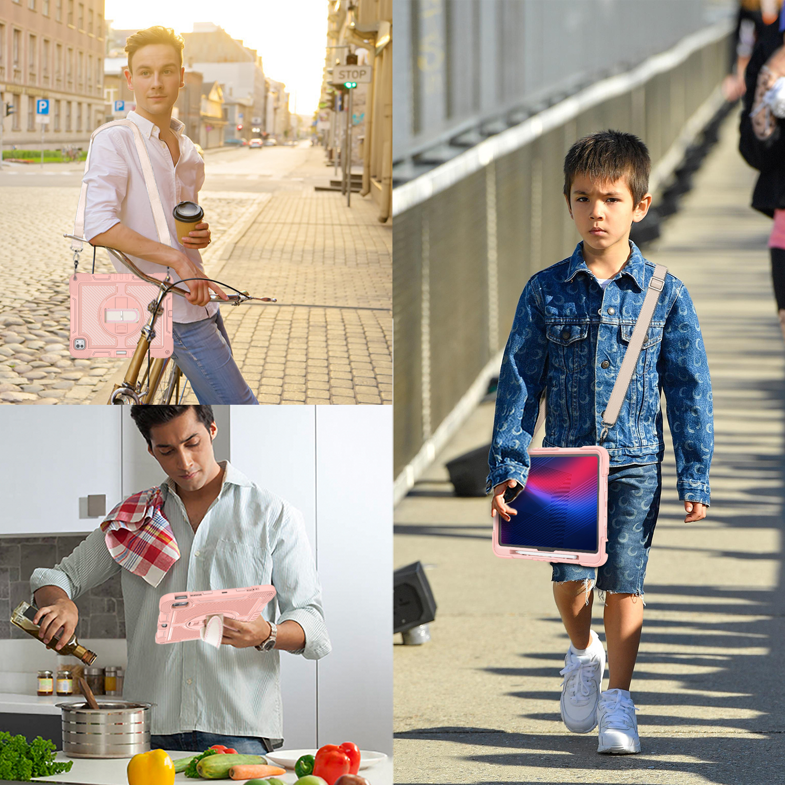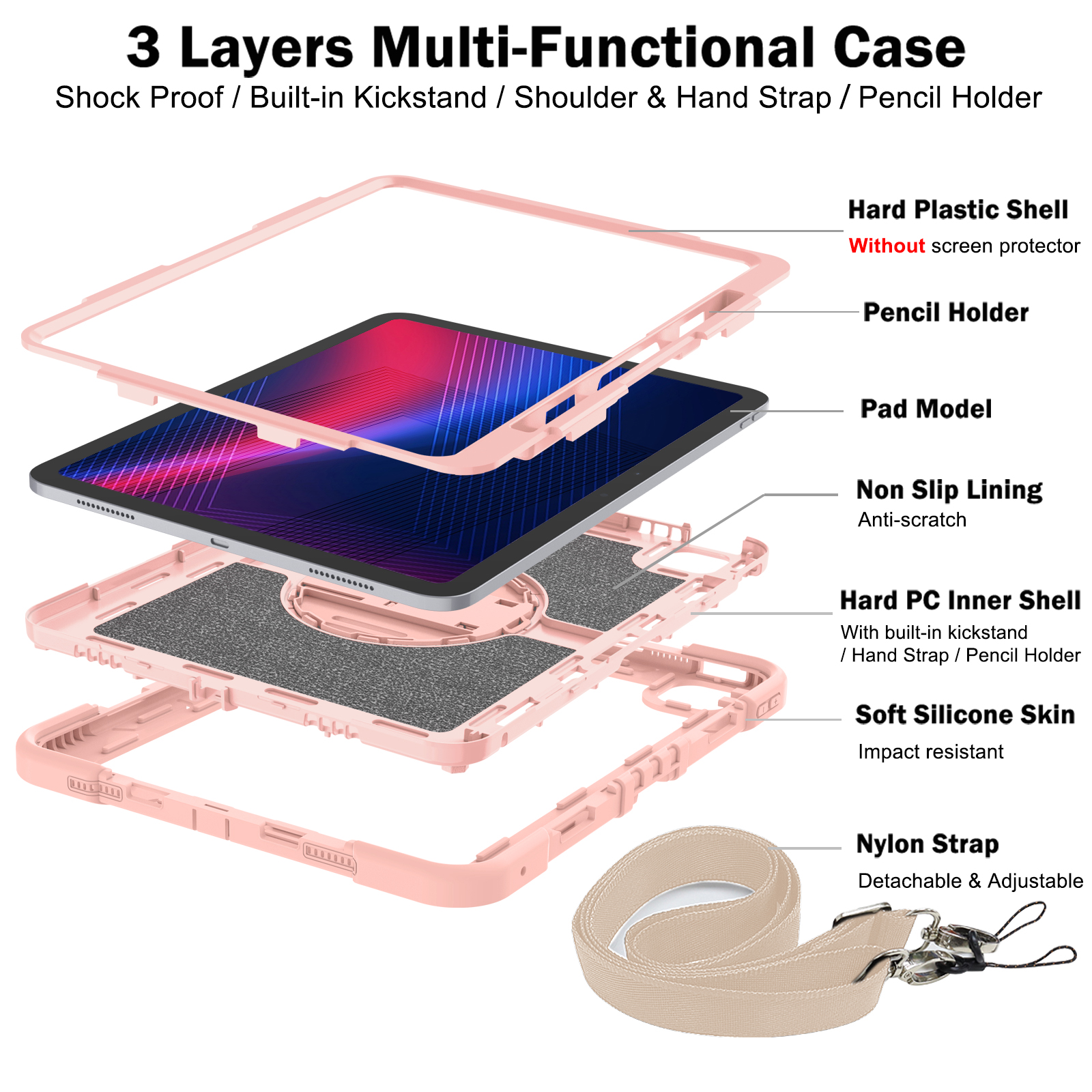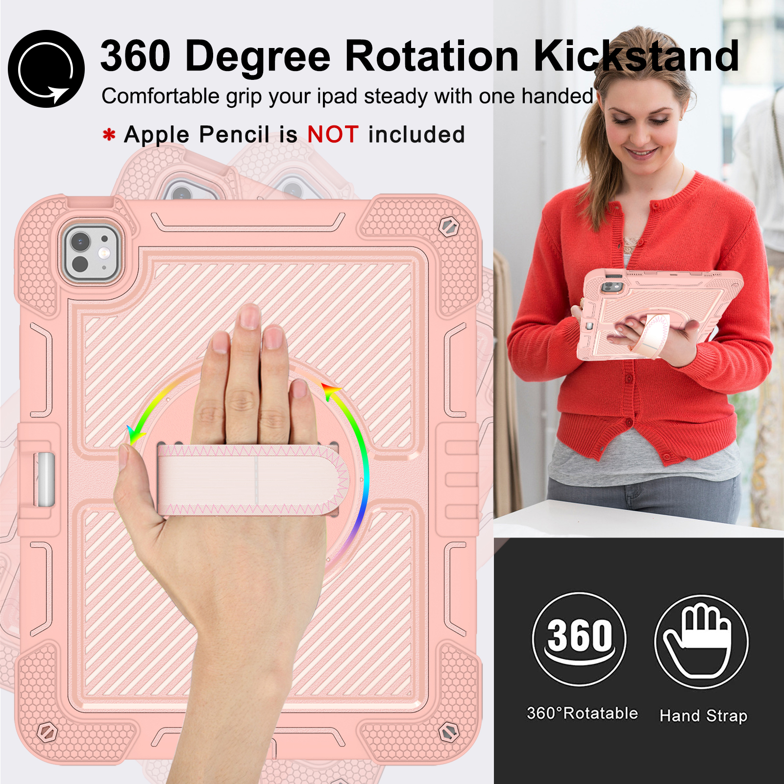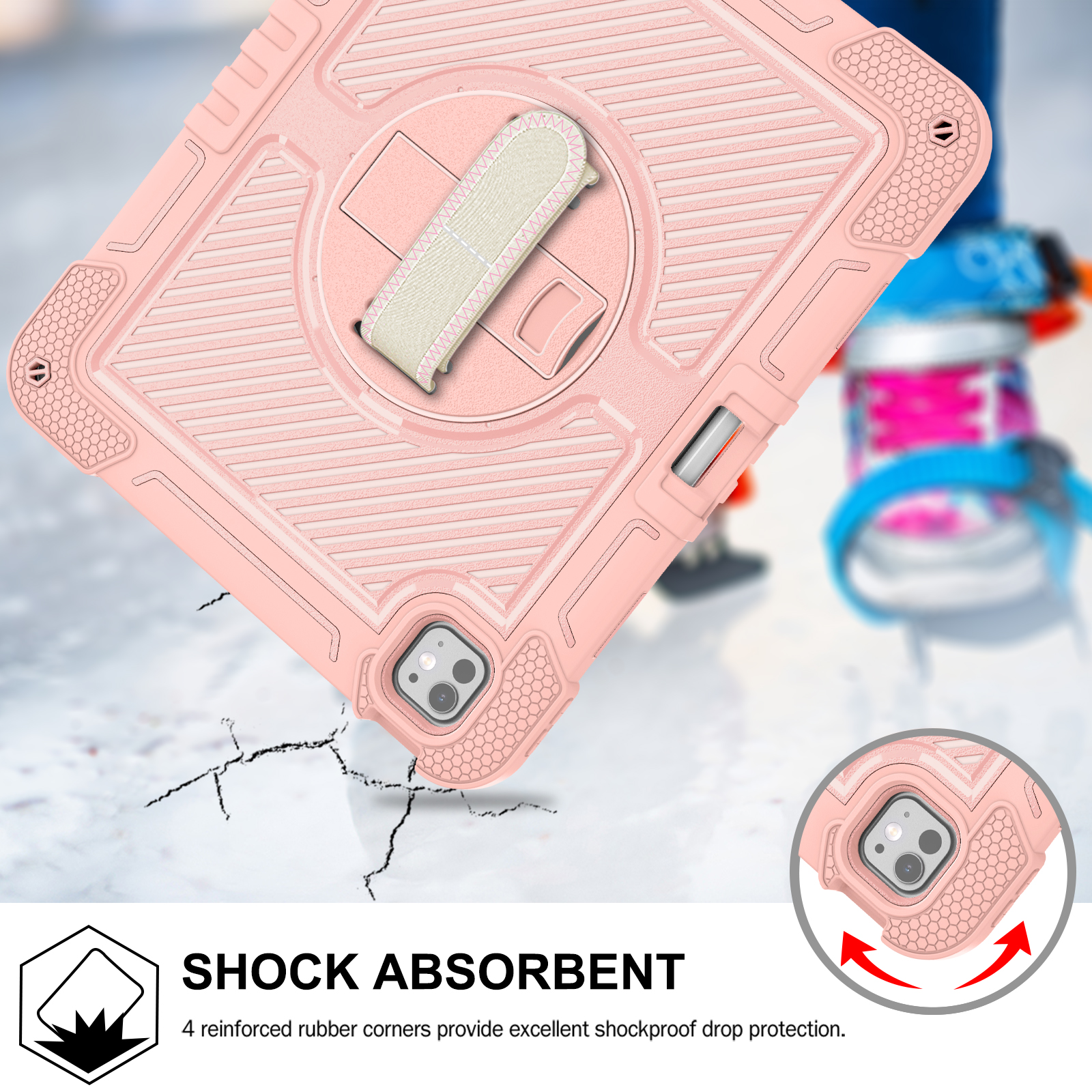 Delicate yet durable pink silicone case for iPad Pro 13" (2024), featuring triple-layer shockproof protection, a 360° rotatable kickstand, hand strap, and shoulder strap for education or family use.