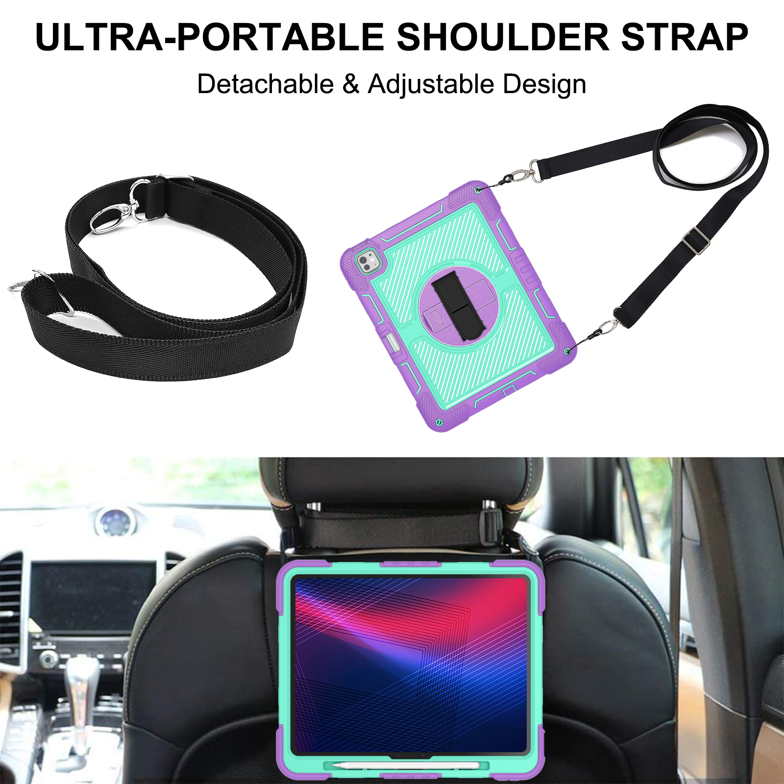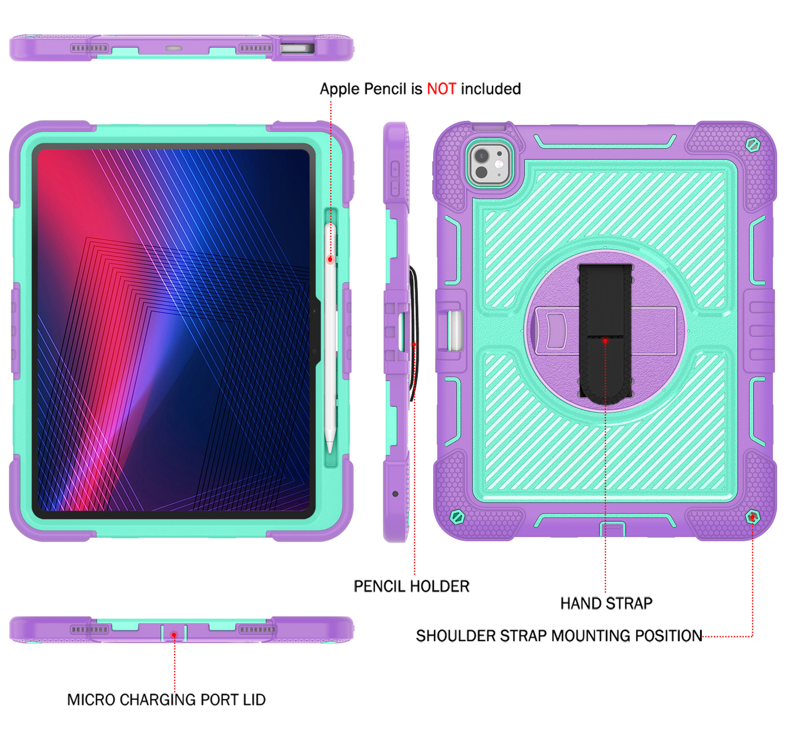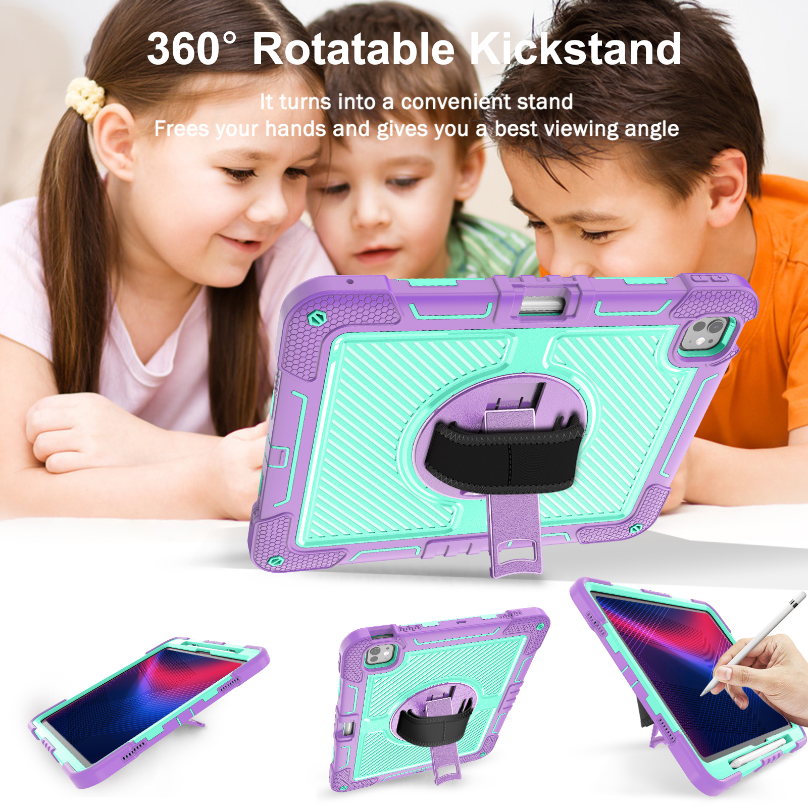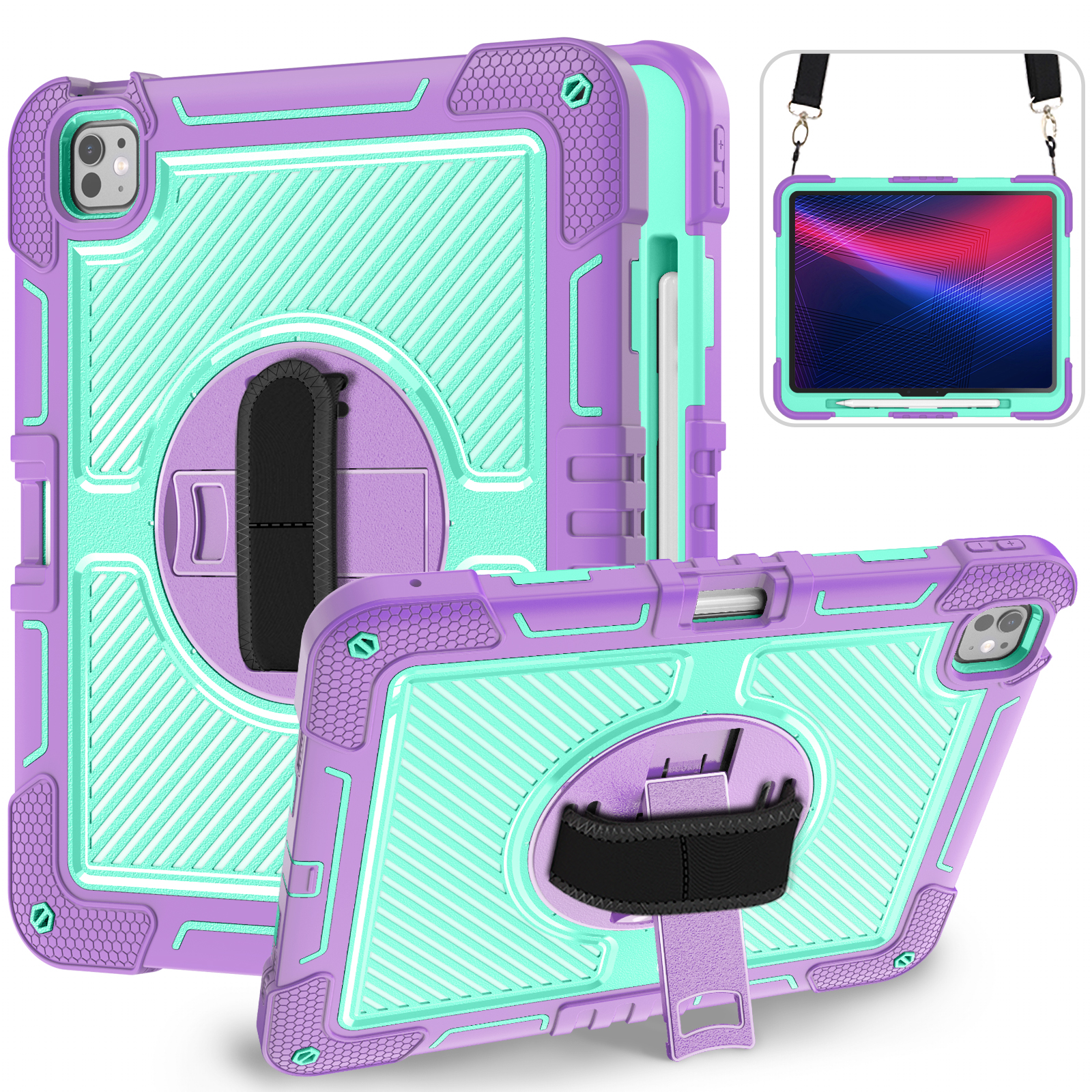 Colorful, shockproof case for iPad Pro 13" (2024) in Purple + Mint Green. Combines triple-layer full-body protection with a rotating kickstand, hand strap, and shoulder strap—perfect for kids and education.