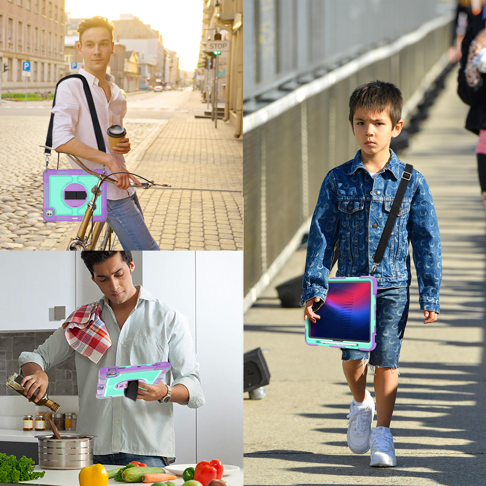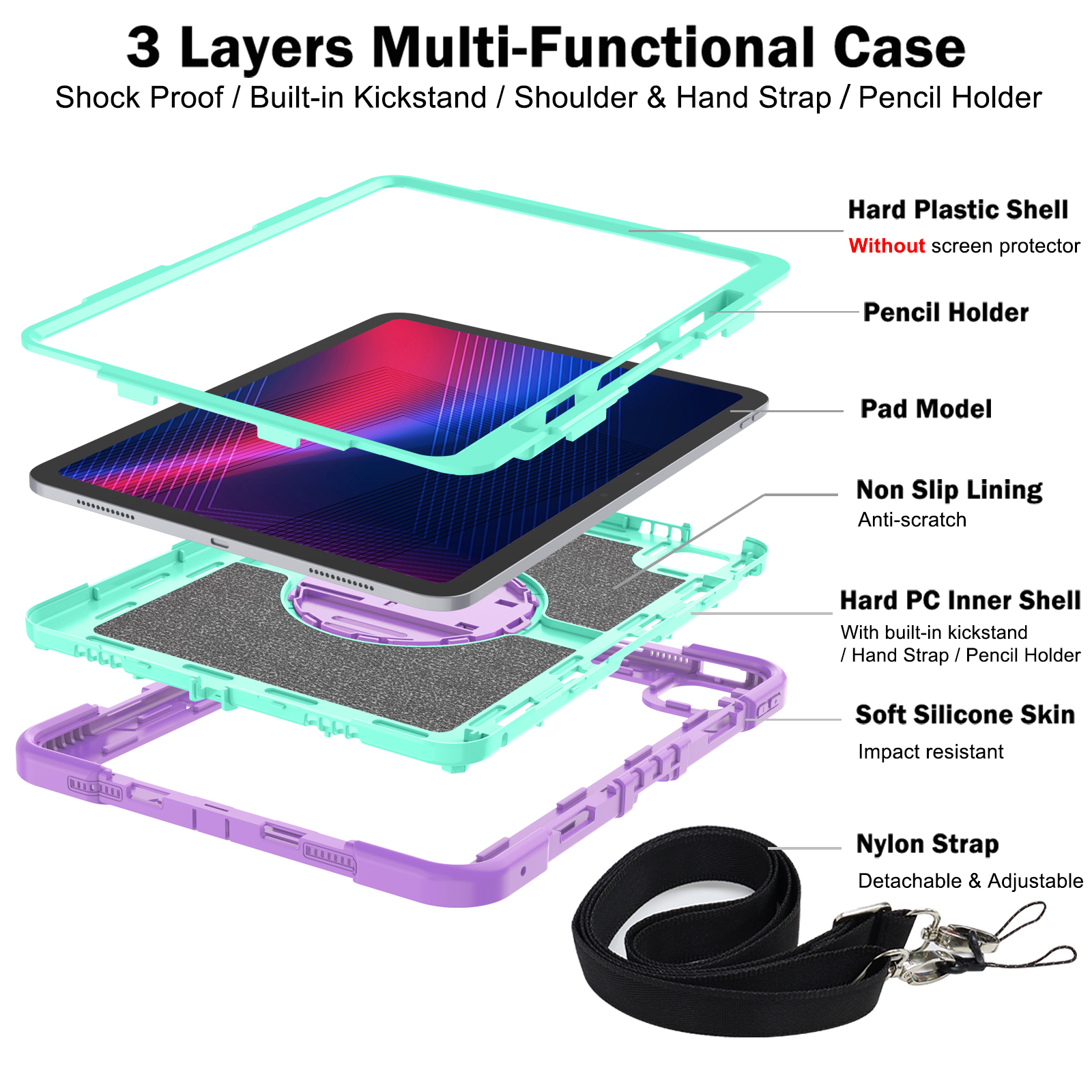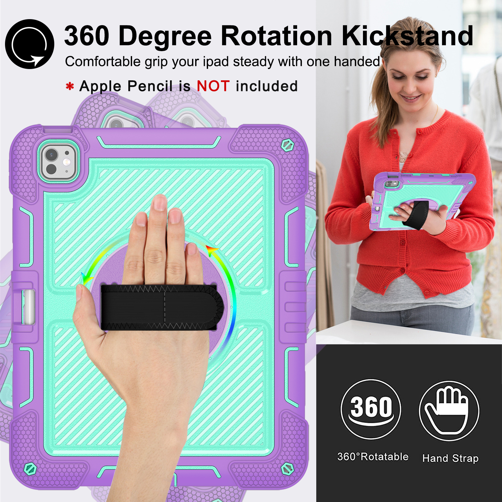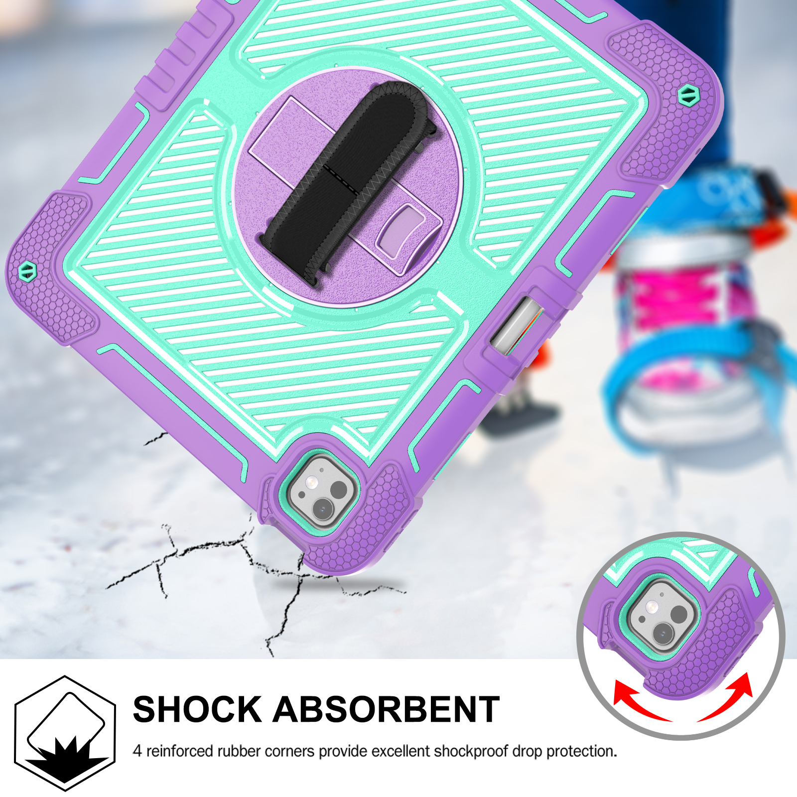 Colorful, shockproof case for iPad Pro 13" (2024) in Purple + Mint Green. Combines triple-layer full-body protection with a rotating kickstand, hand strap, and shoulder strap—perfect for kids and education.