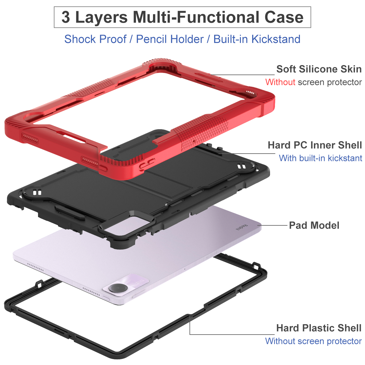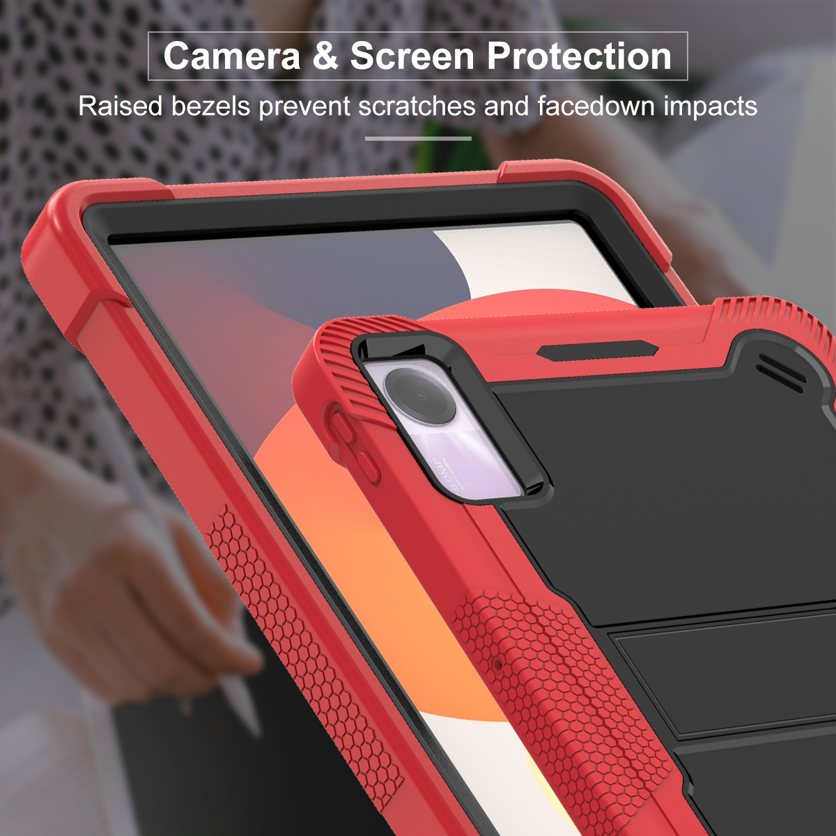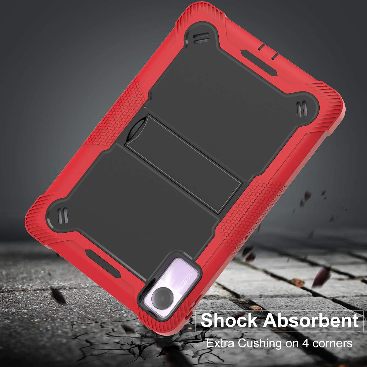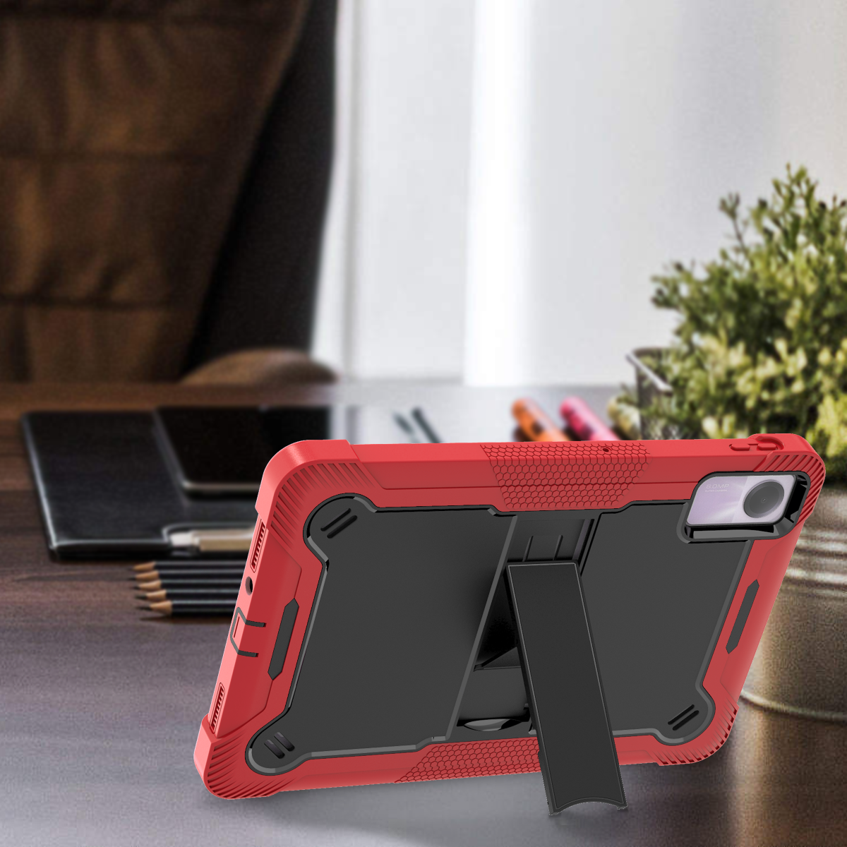 Crafted for extreme durability, this premium 3-layer hybrid case in red & black is a kid-friendly defender for the Redmi Pad SE 11 inch. Built with full-body rugged protection and a sturdy kickstand.
