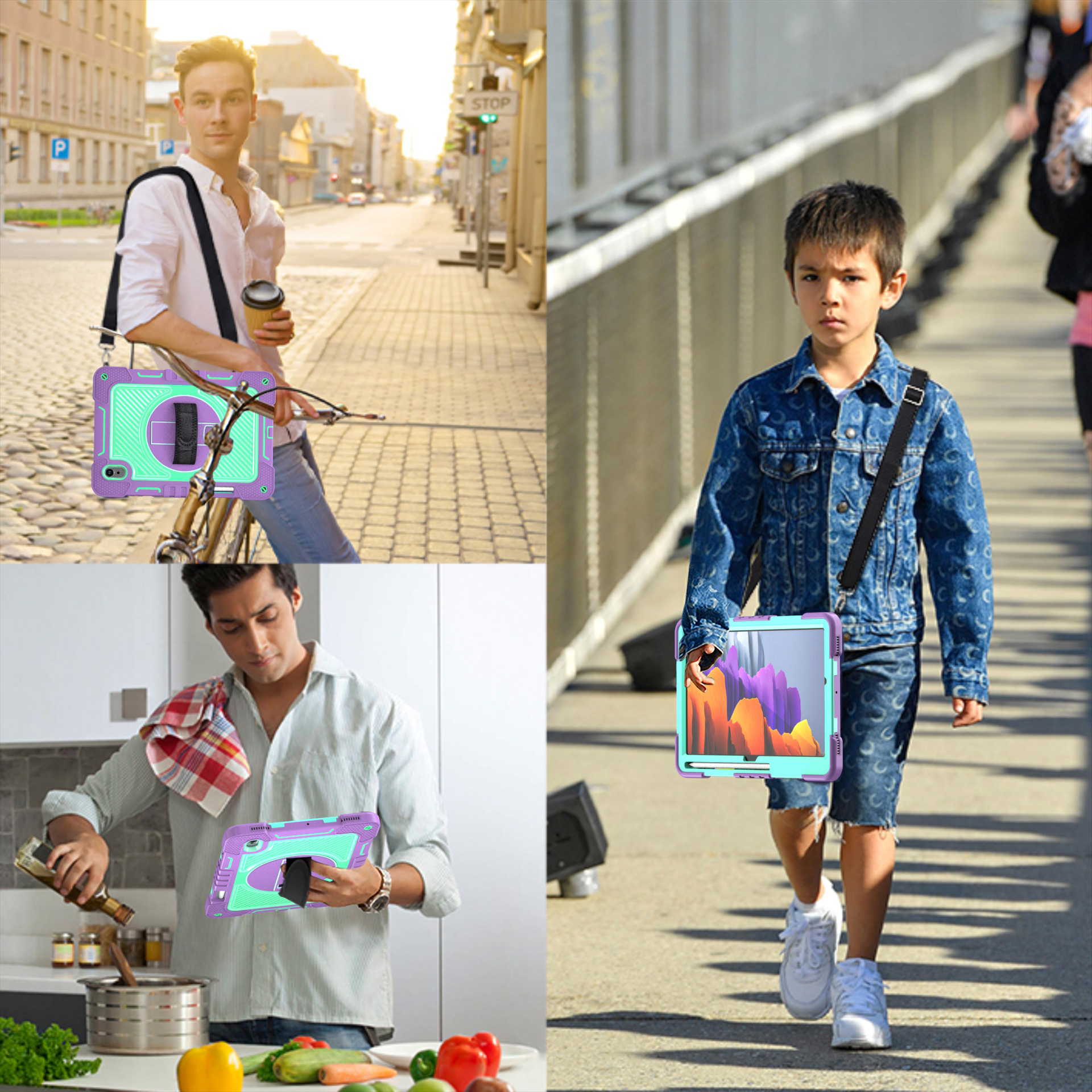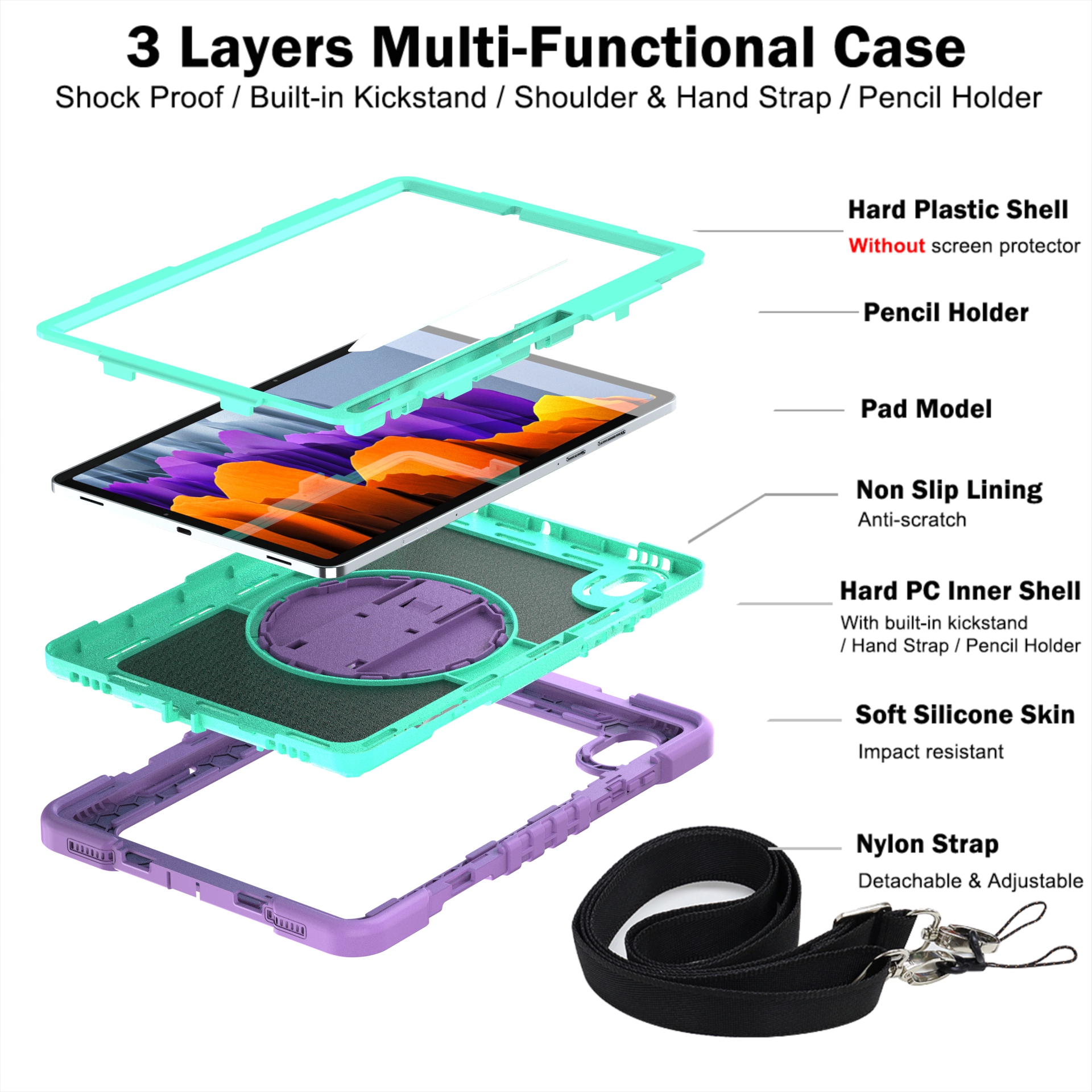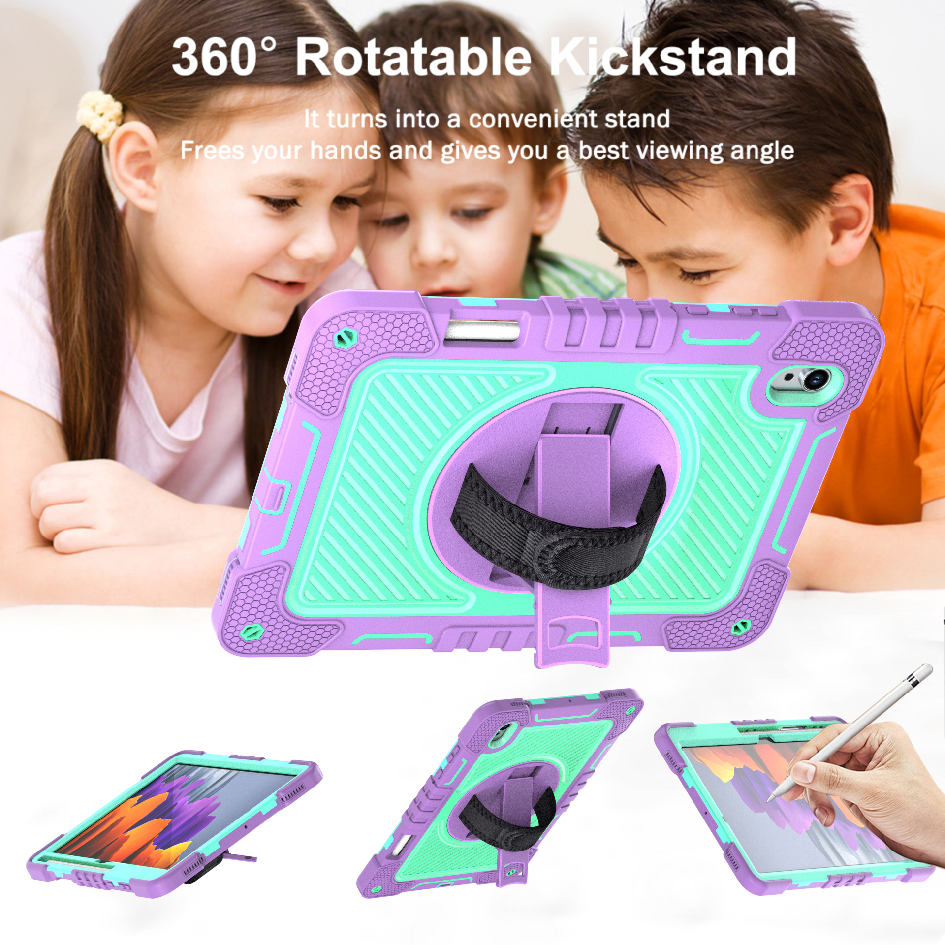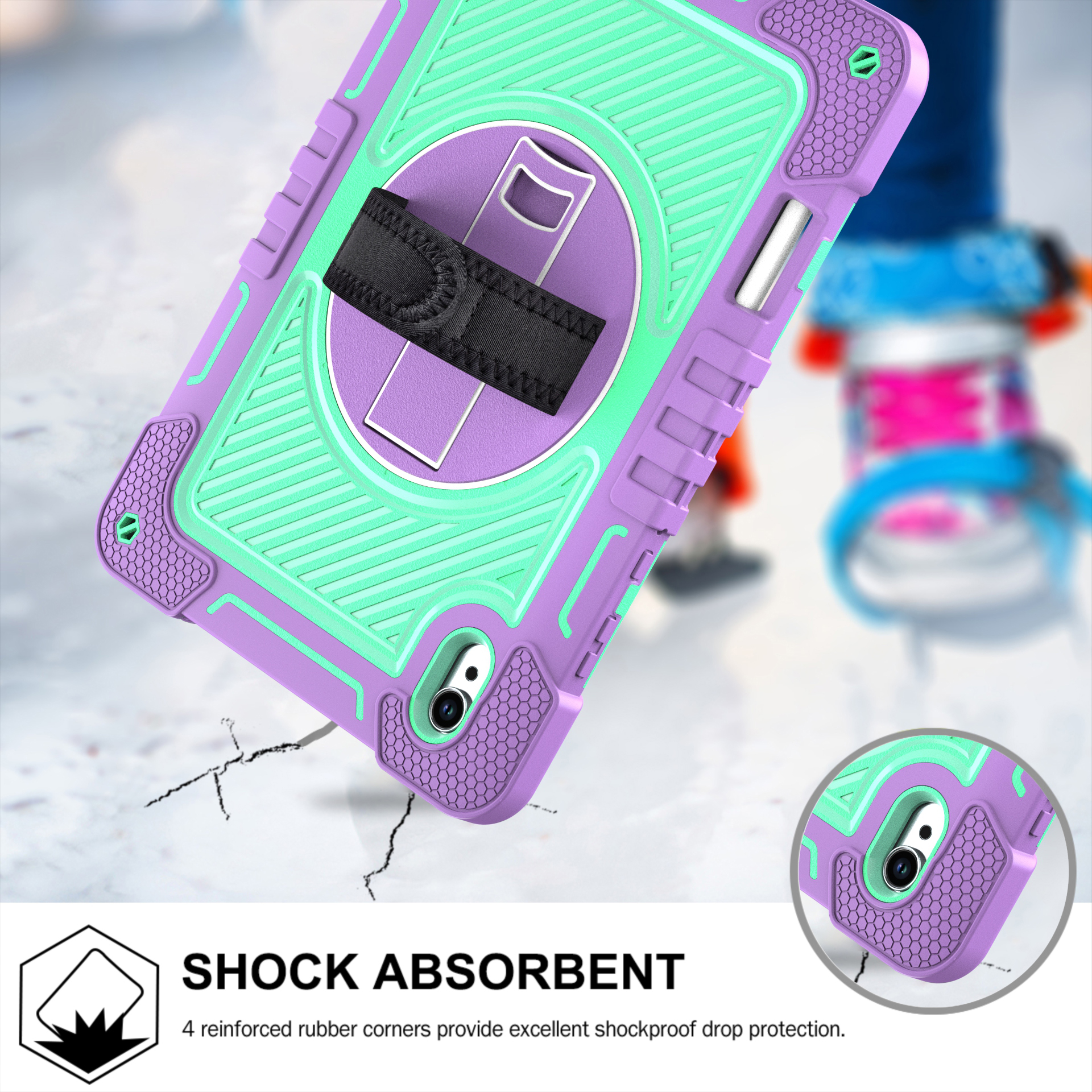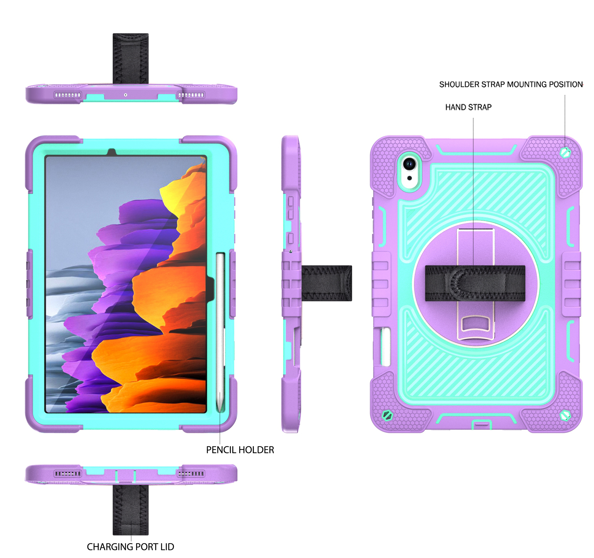 Stylish and protective case for Samsung Tab S11 with 360° rotatable stand, triple-layer protection, and hand/shoulder strap in purple and mint green color.