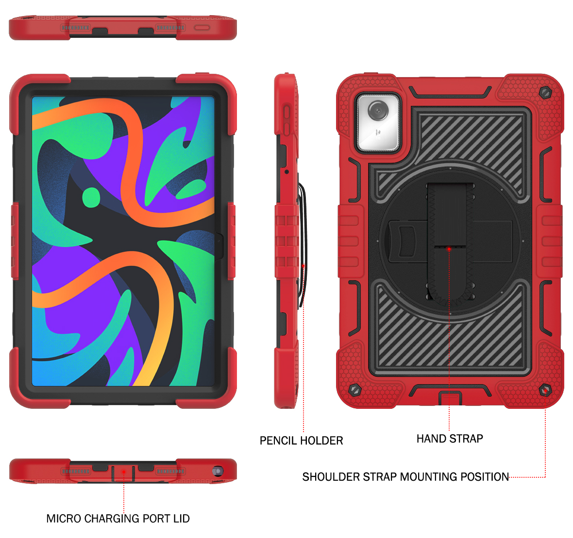 Durable red and black tablet case for Lenovo Tab M11 2024, featuring triple-layer construction, 360° kickstand, and hand/shoulder strap.