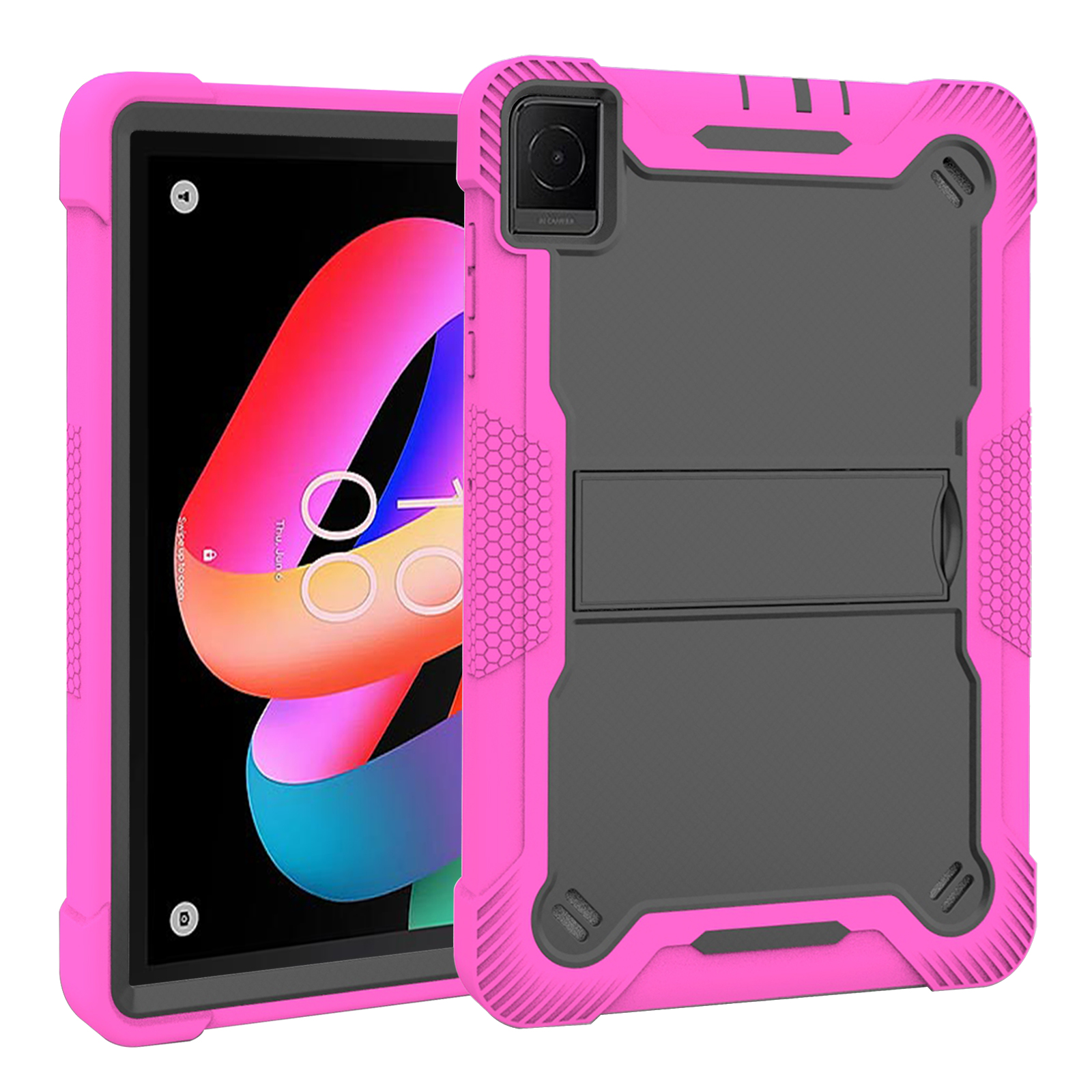 Shockproof hot pink rugged survivor-style case for TCL Tab 10L. Features silicone wrap, impact-resistant shell, and kid-friendly stand. Built for home, school and drops.